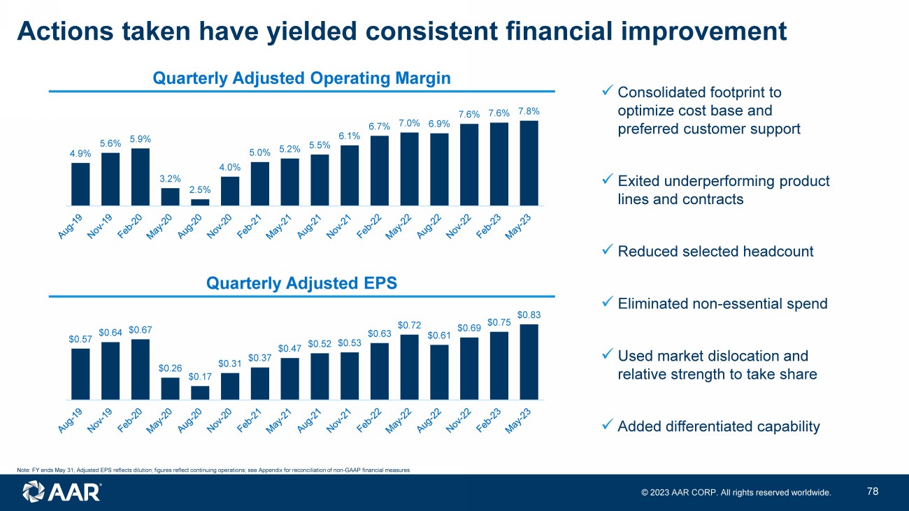 © 2023 AAR CORP. All rights reserved worldwide. 33 x Consolidated footprint to optimize cost base and preferred customer support x Exited underperforming product lines and contracts x Reduced selected headcount x Eliminated non - essential spend x Used market dislocation and relative strength to take share x Added differentiated capability Actions taken have yielded consistent financial improvement Note: FY ends May 31; Adjusted EPS reflects dilution; figures reflect continuing operations; see Appendix for reconciliation of non - GAAP financial measures 4.9% 5.6% 5.9% 3.2% 2.5% 4.0% 5.0% 5.2% 5.5% 6.1% 6.7% 7.0% 6.9% 7.6% 7.6% 7.8% Quarterly Adjusted Operating Margin $0.57 $0.64 $0.67 $0.26 $0.17 $0.31 $0.37 $0.47 $0.52 $0.53 $0.63 $0.72 $0.61 $0.69 $0.75 $0.83 Quarterly Adjusted EPS