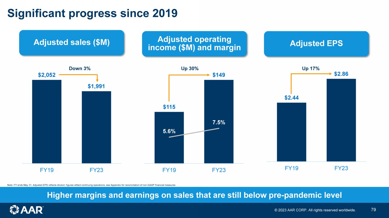 © 2023 AAR CORP. All rights reserved worldwide. 34 Significant progress since 2019 $2,052 $1,991 FY19 FY23 $115 $149 5.6% 7.5% FY19 FY23 $2.44 $2.86 FY19 FY23 Adjusted sales ($M) Adjusted operating income ($M) and margin Adjusted EPS Down 3% Up 30% Up 17% Higher margins and earnings on sales that are still below pre - pandemic level Note: FY ends May 31; Adjusted EPS reflects dilution; figures reflect continuing operations; see Appendix for reconciliation of non - GAAP financial measures
