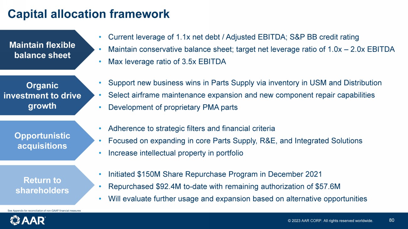 © 2023 AAR CORP. All rights reserved worldwide. 35 • Current leverage of 1.1x net debt / Adjusted EBITDA; S&P BB credit rating • Maintain conservative balance sheet; target net leverage ratio of 1.0x – 2.0x EBITDA • Max leverage ratio of 3.5x EBITDA • Support new business wins in Parts Supply via inventory in USM and Distribution • Select airframe maintenance expansion and new component repair capabilities • Development of proprietary PMA parts • Adherence to strategic filters and financial criteria • Focused on expanding in core Parts Supply, R&E, and Integrated Solutions • Increase intellectual property in portfolio • Initiated $150M Share Repurchase Program in December 2021 • Repurchased $92.4M to - date with remaining authorization of $57.6M • Will evaluate further usage and expansion based on alternative opportunities Maintain flexible balance sheet Organic investment to drive growth Opportunistic acquisitions Return to shareholders Capital allocation framework See Appendix for reconciliation of non - GAAP financial measures