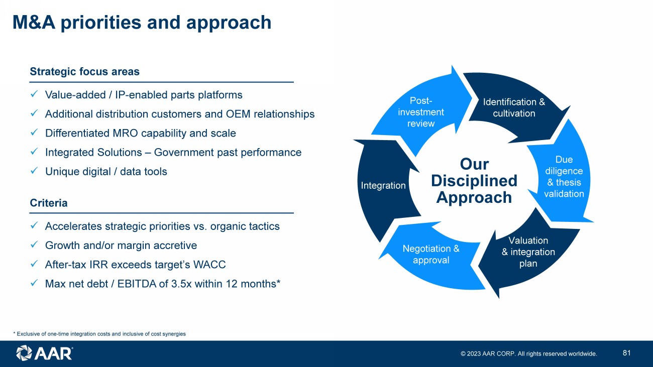 © 2023 AAR CORP. All rights reserved worldwide. 36 M&A priorities and approach Strategic focus areas x Value - added / IP - enabled parts platforms x Additional distribution customers and OEM relationships x Differentiated MRO capability and scale x Integrated Solutions – Government past performance x Unique digital / data tools Criteria x Accelerates strategic priorities vs. organic tactics x Growth and/or margin accretive x After - tax IRR exceeds target’s WACC x Max net debt / EBITDA of 3.5x within 12 months* Due Diligence Valuation & integration plan Negotiation & approval Integration Post - investment review Due diligence & thesis validation Identification & cultivation * Exclusive of one - time integration costs and inclusive of cost synergies Our Disciplined Approach