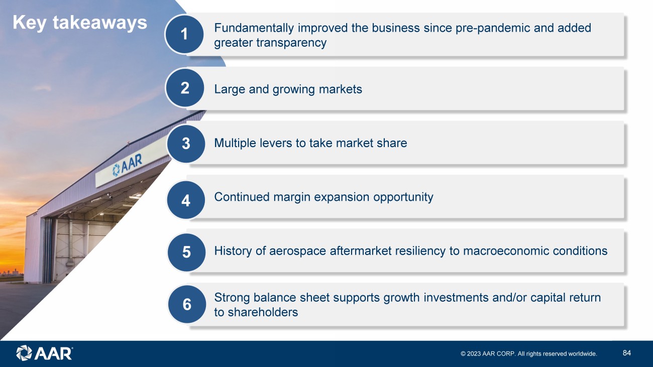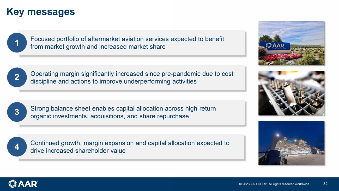 © 2023 AAR CORP. All rights reserved worldwide. 37 1 2 3 4 Focused portfolio of aftermarket aviation services expected to benefit from market growth and increased market share Operating margin significantly increased since pre - pandemic due to cost discipline and actions to improve underperforming activities Continued growth, margin expansion and capital allocation expected to drive increased shareholder value Strong balance sheet enables capital allocation across high - return organic investments, acquisitions, and share repurchase Key messages