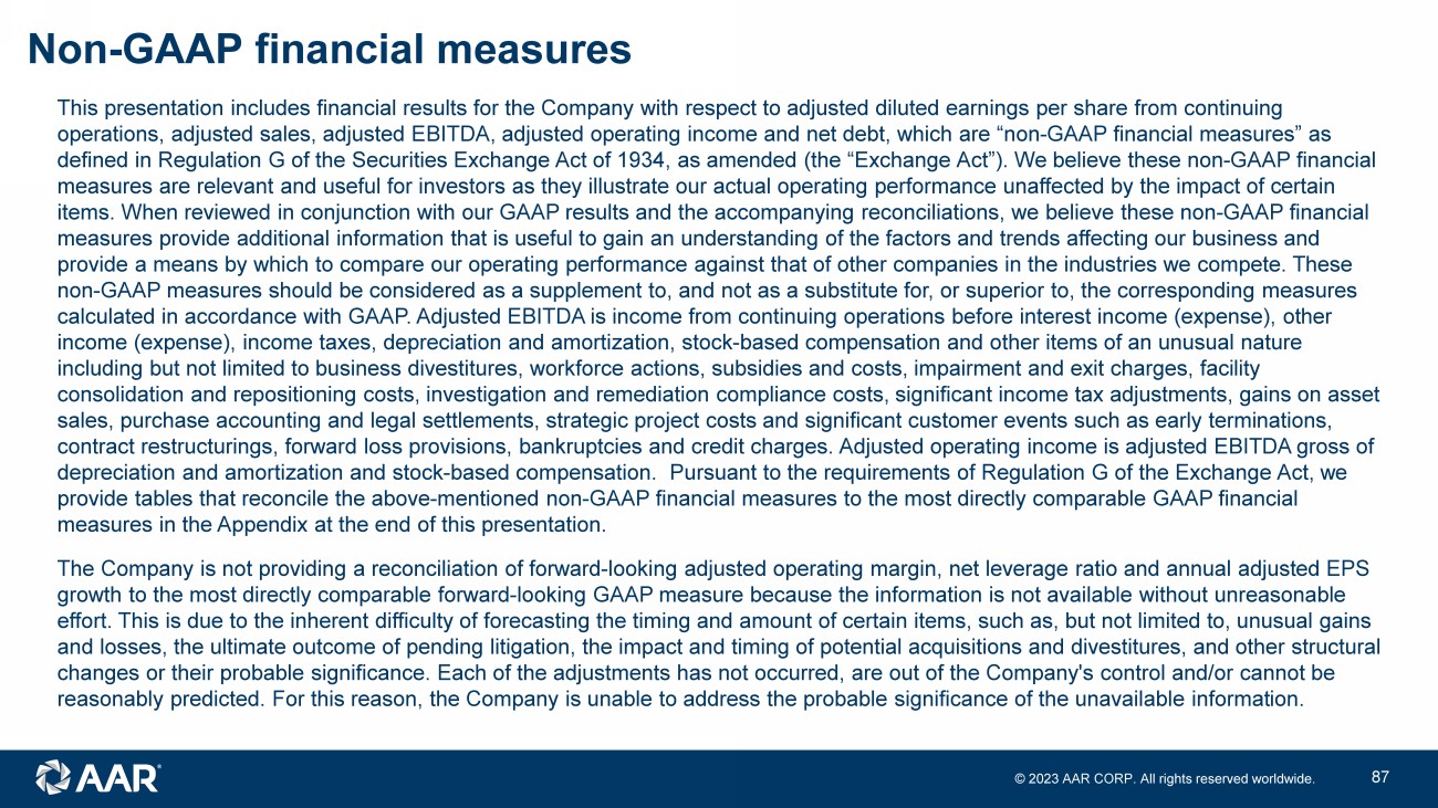 © 2023 AAR CORP. All rights reserved worldwide. 42 Non - GAAP financial measures This presentation includes financial results for the Company with respect to adjusted diluted earnings per share from continu ing operations, adjusted sales, adjusted EBITDA, adjusted operating income and net debt, which are “non - GAAP financial measures” as defined in Regulation G of the Securities Exchange Act of 1934, as amended (the “Exchange Act”). We believe these non - GAAP finan cial measures are relevant and useful for investors as they illustrate our actual operating performance unaffected by the impact o f c ertain items. When reviewed in conjunction with our GAAP results and the accompanying reconciliations, we believe these non - GAAP financ ial measures provide additional information that is useful to gain an understanding of the factors and trends affecting our busin ess and provide a means by which to compare our operating performance against that of other companies in the industries we compete. T hes e non - GAAP measures should be considered as a supplement to, and not as a substitute for, or superior to, the corresponding measur es calculated in accordance with GAAP. Adjusted EBITDA is income from continuing operations before interest income (expense), ot her income (expense), income taxes, depreciation and amortization, stock - based compensation and other items of an unusual nature including but not limited to business divestitures, workforce actions, subsidies and costs, impairment and exit charges, faci lit y consolidation and repositioning costs, investigation and remediation compliance costs, significant income tax adjustments, ga ins on asset sales, purchase accounting and legal settlements, strategic project costs and significant customer events such as early termi nat ions, contract restructurings, forward loss provisions, bankruptcies and credit charges. Adjusted operating income is adjusted EBIT DA gross of depreciation and amortization and stock - based compensation. Pursuant to the requirements of Regulation G of the Exchange Act, w e provide tables that reconcile the above - mentioned non - GAAP financial measures to the most directly comparable GAAP financial measures in the Appendix at the end of this presentation. The Company is not providing a reconciliation of forward - looking adjusted operating margin, net leverage ratio and annual adjust ed EPS growth to the most directly comparable forward - looking GAAP measure because the information is not available without unreasonabl e effort. This is due to the inherent difficulty of forecasting the timing and amount of certain items, such as, but not limite d t o, unusual gains and losses, the ultimate outcome of pending litigation, the impact and timing of potential acquisitions and divestitures, and ot her structural changes or their probable significance. Each of the adjustments has not occurred, are out of the Company's control and/or can not be reasonably predicted. For this reason, the Company is unable to address the probable significance of the unavailable informat ion .
