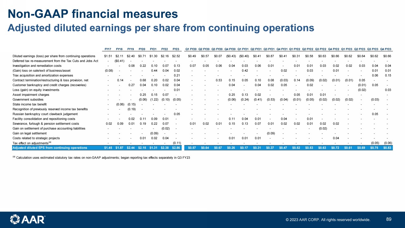 © 2023 AAR CORP. All rights reserved worldwide. 44 Adjusted diluted earnings per share from continuing operations Non - GAAP financial measures FY17 FY18 FY19 FY20 FY21 FY22 FY23 Q1 FY20 Q2 FY20 Q3 FY20 Q4 FY20 Q1 FY21 Q2 FY21 Q3 FY21 Q4 FY21Q1 FY22 Q2 FY22 Q3 FY22 Q4 FY22 Q1 FY23 Q2 FY23 Q3 FY23 Q4 FY23 Diluted earnings (loss) per share from continuing operations $1.51 $2.11 $2.40 $0.71 $1.30 $2.16 $2.52 $0.49 $0.57 $0.07 ($0.43) ($0.40) $0.41 $0.87 $0.41 $0.31 $0.58 $0.63 $0.66 $0.62 $0.64 $0.62 $0.66 Deferred tax re-measurement from the Tax Cuts and Jobs Act - ($0.41) - - - - - - - - - - - - - - - - - - - - - Investigation and remediation costs - - 0.08 0.22 0.10 0.07 0.13 0.07 0.05 0.06 0.04 0.03 0.06 0.01 - 0.01 0.01 0.03 0.02 0.02 0.03 0.04 0.04 (Gain) loss on sale/exit of business/asset (0.08) - - - 0.44 0.04 0.02 - - - - 0.42 - - 0.02 - 0.03 - 0.01 - - 0.01 0.01 Trax acquisition and amortization expenses - - - - - - 0.21 - - - - - - - - - - - - - - 0.06 0.15 Contract termination/restructuring & loss provision, net - 0.14 - 0.68 0.20 0.02 0.04 - - 0.53 0.15 0.05 0.10 0.08 (0.03) 0.14 (0.09) (0.02) (0.01) (0.01) 0.05 - - Customer bankruptcy and credit charges (recoveries) - - 0.27 0.04 0.10 0.02 0.04 - - - 0.04 - 0.04 0.02 0.05 - 0.02 - - - (0.01) 0.05 - Loss (gain) on equity investments - - - - - - 0.01 - - - - - - - - - - - - - (0.02) 0.03 Asset impairment charges - - - 0.25 0.15 0.07 - - - - 0.25 0.13 0.02 - - 0.05 0.01 0.01 - - - - Government subsidies - - - (0.06) (1.22) (0.10) (0.05) - - - (0.06) (0.24) (0.41) (0.53) (0.04) (0.01) (0.05) (0.02) (0.02) (0.02) - (0.03) - State income tax benefit - (0.06) (0.15) - - - - - - - - - - - - - - - - - - - - Recognition of previously reserved income tax benefits - - (0.19) - - - - - - - - - - - - - - - - - - - - Russian bankruptcy court clawback judgement - - - - - - 0.05 - - - - - - - - - - - - - - 0.05 - Facility consolidation and repositioning costs - - 0.02 0.11 0.09 0.01 - - - - 0.11 0.04 0.01 - 0.04 - 0.01 - - - - - - Severance, furlough & pension settlement costs 0.02 0.09 0.01 0.19 0.22 0.07 - 0.01 0.02 0.01 0.15 0.13 0.07 0.01 0.02 0.02 0.01 0.02 0.02 - - - - Gain on settlement of purchase accounting liabilities - - - - - (0.02) - - - - - - - - - - - (0.02) - - - - - Gain on legal settlement - - - - (0.09) - - - - - - - - (0.09) - - - - - - - - - Costs related to strategic projects - - - 0.01 0.02 0.04 - - - - 0.01 0.01 0.01 - - - - - 0.04 - - - - Tax effect on adjustments (a) - - - - - - (0.11) - - - - - - - - - - - - - - (0.05) (0.06) Adjusted diluted EPS from continuing operations $1.45 $1.87 $2.44 $2.15 $1.31 $2.38 $2.86 $0.57 $0.64 $0.67 $0.26 $0.17 $0.31 $0.37 $0.47 $0.52 $0.53 $0.63 $0.72 $0.61 $0.69 $0.75 $0.83 (a) Calculation uses estimated statutory tax rates on non-GAAP adjustments; began reporting tax effects separately in Q3 FY23