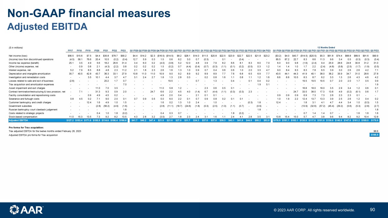 © 2023 AAR CORP. All rights reserved worldwide. 45 Adjusted EBITDA Non - GAAP financial measures ($ in millions) 12 Months Ended FY17 FY18 FY19 FY20 FY21 FY22 FY23 Q1 FY20Q2 FY20Q3 FY20Q4 FY20Q1 FY21Q2 FY21Q3 FY21Q4 FY21Q1 FY22Q2 FY22Q3 FY22Q4 FY22Q1 FY23Q2 FY23Q3 FY23Q4 FY23 Q1 FY20Q2 FY20Q3 FY20Q1 FY21Q2 FY21Q3 FY21Q1 FY22Q2 FY22Q3 FY22Q1 FY23Q2 FY23Q3 FY23 Net income (loss) $56.5 $15.6 $7.5 $4.4 $35.8 $78.7 $90.2 $4.4 $14.2 $2.3 ($16.5) ($14.5) $8.2 $28.1 $14.0 $11.5 $20.8 $22.5 $23.9 $22.7 $22.5 $21.8 $23.2 ($3.2) $4.0 $43.7 ($14.5) ($20.5) $5.3 $61.8 $74.4 $68.8 $89.9 $91.6 $90.9 (Income) loss from discontinued operations (4.5) 58.1 76.6 20.4 10.5 (0.2) (0.4) 12.7 5.9 0.3 1.5 0.6 6.2 3.0 0.7 (0.3) - 0.1 - (0.4) - - - 85.5 87.2 22.7 8.3 8.6 11.3 9.6 3.4 0.5 (0.3) (0.3) (0.4) Income tax expense (benefit) 25.1 3.5 4.9 5.6 18.2 26.6 31.4 3.4 6.0 0.2 (4.0) (3.8) 5.2 12.0 4.8 3.9 7.9 8.2 6.6 8.1 8.3 8.0 7.0 6.0 9.0 9.8 (1.6) (2.4) 9.4 25.9 28.6 24.8 30.8 31.2 31.0 Other (income) expense, net - 0.9 0.8 2.1 (4.3) (2.2) 0.8 0.2 0.2 0.2 1.5 (0.2) 0.7 (4.4) (0.4) (0.7) (0.3) (1.1) (0.1) (0.2) (0.5) 0.3 1.2 1.4 1.4 1.0 1.7 2.2 (2.4) (4.8) (5.8) (2.5) (1.7) (1.9) (0.5) Interest expense, net 5.2 7.9 8.5 8.8 4.8 2.3 11.2 2.1 1.8 2.3 2.6 1.6 1.3 1.0 0.9 0.7 0.4 0.6 0.6 1.0 2.0 3.5 4.7 9.0 8.4 8.3 8.3 7.8 6.5 3.9 3.0 2.6 2.6 4.2 7.1 Depreciation and intangible amortization 35.7 40.5 42.8 43.7 36.3 33.1 27.9 10.8 11.0 11.0 10.9 9.0 9.2 8.9 9.2 8.9 8.9 7.7 7.6 6.8 6.5 6.9 7.7 43.5 44.1 44.3 41.9 40.1 38.0 36.2 35.9 34.7 31.0 28.6 27.8 Investigation and remediation costs - - 3.5 10.1 4.4 3.7 4.7 3.1 2.4 2.7 1.8 1.3 2.8 0.3 - 0.2 0.8 1.6 1.1 0.8 1.1 1.2 1.6 6.6 8.8 10.5 8.3 8.7 6.2 3.3 1.3 2.6 4.3 4.6 4.2 Losses related to sale and exit of business (2.6) - - - 20.2 1.7 0.7 - - - - 19.5 - - 0.7 - 1.3 - 0.4 - 0.1 0.4 0.2 - - - 19.5 19.5 19.5 0.7 2.0 2.0 1.7 0.5 0.9 Trax acquisition and amortization expenses - - - - - - 7.0 - - - - - - - - - - - - - - 1.9 5.1 - - - - - - - - - - - 1.9 Asset impairment and exit charges - - - 11.0 7.0 3.5 - - - - 11.0 5.8 1.2 - - 2.3 0.6 0.5 0.1 - - - - - - - 16.8 18.0 18.0 3.5 2.9 3.4 1.2 0.6 0.1 Contract termination/restructuring & loss provision, net - 7.1 - 31.3 9.3 0.9 2.0 - - 24.7 6.6 2.2 4.5 4.0 (1.4) 6.7 (4.4) (1.1) (0.3) (0.3) 2.3 - - - - 24.7 33.5 38.0 17.3 13.8 4.9 (0.2) (6.1) 0.6 1.7 Facility consolidation and repositioning costs - - 0.9 4.9 4.5 0.2 - - - - 4.9 2.0 0.4 - 2.1 0.1 0.1 - - - - - - 0.9 0.9 0.9 6.9 7.3 7.3 2.6 2.3 2.3 0.1 - - Severance and furlough costs 0.8 4.5 0.2 7.1 9.0 2.0 0.1 0.7 0.9 0.5 5.0 6.0 2.2 0.1 0.7 0.9 0.8 0.2 0.1 0.1 - - - 1.0 1.9 2.2 12.4 13.7 13.3 3.9 2.5 2.6 1.2 0.4 0.2 Customer bankruptcy and credit charges - - 12.4 1.6 4.9 1.0 1.5 - - - 1.6 0.2 1.3 1.0 2.4 - 1.0 - - - (0.3) 1.8 - 12.4 - - 1.8 3.1 4.1 4.7 4.4 3.4 1.0 (0.3) 1.5 Government subsidies - - - (2.8) (56.2) (4.9) (1.6) - - - (2.8) (11.1) (18.7) (24.6) (1.8) (0.3) (2.5) (1.0) (1.1) (0.7) - (0.9) - - - - (13.9) (32.6) (57.2) (45.4) (29.2) (5.6) (5.3) (2.8) (2.7) Russian bankruptcy court clawback judgement - - - - - - 1.8 - - - - - - - - - - - - - - 1.8 - - - - - - - - - - - - 1.8 Costs related to strategic projects - - - 0.4 1.0 1.8 (0.2) - - - 0.4 0.3 0.7 - - - - - 1.8 (0.2) - - - - - - 0.7 1.4 1.4 0.7 - - 1.6 1.6 1.6 Stock-based compensation 11.0 15.3 13.5 7.3 9.2 8.2 13.5 4.3 2.8 3.2 (3.0) 2.7 1.8 2.3 2.4 3.1 1.6 1.1 2.4 4.1 2.8 3.5 3.1 13.8 15.4 15.0 5.7 4.7 3.8 9.6 9.4 8.2 9.2 10.4 12.8 Adjusted EBITDA $127.2 $153.4 $171.6 $155.9 $114.6 $156.4 $190.6 $41.7 $45.2 $47.4 $21.5 $21.6 $27.0 $31.7 $34.3 $37.0 $37.0 $39.3 $43.1 $41.8 $44.8 $50.2 $53.8 $176.9 $181.1 $183.1 $135.8 $117.6 $101.8 $130.0 $140.0 $147.6 $161.2 $169.0 $179.9 Pro forma for Trax acquisition: Trax adjusted EBITDA for the twelve months ended February 28, 2023 $8.6 Adjusted EBITDA pro forma for Trax acquisition $188.5