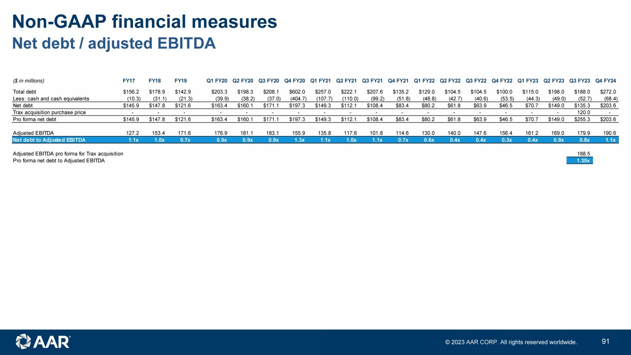 © 2023 AAR CORP. All rights reserved worldwide. 46 Net debt / adjusted EBITDA Non - GAAP financial measures ($ in millions) FY17 FY18 FY19 Q1 FY20 Q2 FY20 Q3 FY20 Q4 FY20 Q1 FY21 Q2 FY21 Q3 FY21 Q4 FY21 Q1 FY22 Q2 FY22 Q3 FY22 Q4 FY22 Q1 FY23 Q2 FY23 Q3 FY23 Q4 FY24 Total debt $156.2 $178.9 $142.9 $203.3 $198.3 $208.1 $602.0 $257.0 $222.1 $207.6 $135.2 $129.0 $104.5 $104.5 $100.0 $115.0 $198.0 $188.0 $272.0 Less: cash and cash equivalents (10.3) (31.1) (21.3) (39.9) (38.2) (37.0) (404.7) (107.7) (110.0) (99.2) (51.8) (48.8) (42.7) (40.6) (53.5) (44.3) (49.0) (52.7) (68.4) Net debt $145.9 $147.8 $121.6 $163.4 $160.1 $171.1 $197.3 $149.3 $112.1 $108.4 $83.4 $80.2 $61.8 $63.9 $46.5 $70.7 $149.0 $135.3 $203.6 Trax acquisition purchase price - - - - - - - - - - - - - - - - - 120.0 - Pro forma net debt $145.9 $147.8 $121.6 $163.4 $160.1 $171.1 $197.3 $149.3 $112.1 $108.4 $83.4 $80.2 $61.8 $63.9 $46.5 $70.7 $149.0 $255.3 $203.6 Adjusted EBITDA 127.2 153.4 171.6 176.9 181.1 183.1 155.9 135.8 117.6 101.8 114.6 130.0 140.0 147.6 156.4 161.2 169.0 179.9 190.6 Net debt to Adjusted EBITDA 1.1x 1.0x 0.7x 0.9x 0.9x 0.9x 1.3x 1.1x 1.0x 1.1x 0.7x 0.6x 0.4x 0.4x 0.3x 0.4x 0.9x 0.8x 1.1x Adjusted EBITDA pro forma for Trax acquisition 188.5 Pro forma net debt to Adjusted EBITDA 1.35x