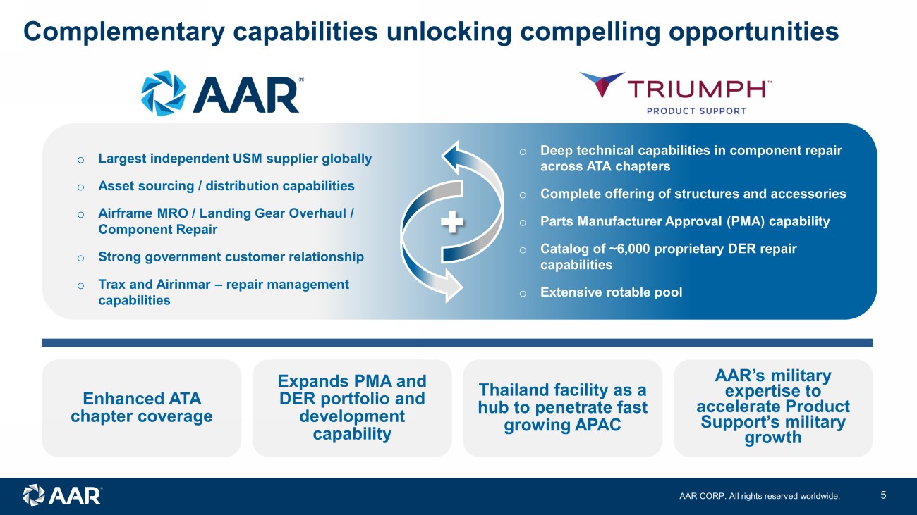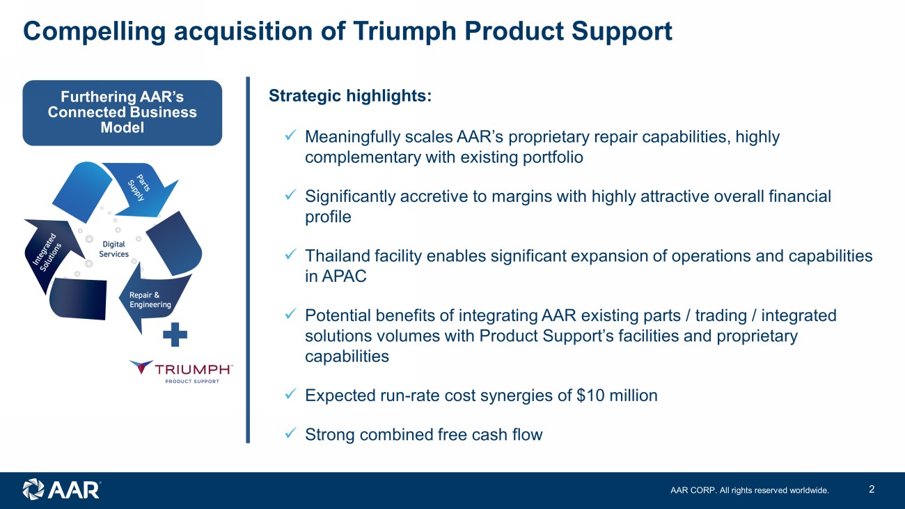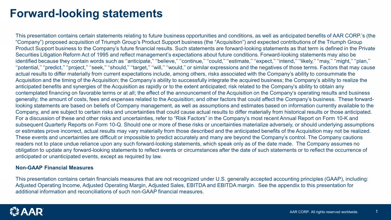 AAR CORP. All rights reserved worldwide. 1 Forward - looking statements This presentation contains certain statements relating to future business opportunities and conditions, as well as anticipate d b enefits of AAR CORP.’s (the “Company”) proposed acquisition of Triumph Group’s Product Support business (the “Acquisition”) and expected contributions of th e Triumph Group Product Support business to the Company’s future financial results. Such statements are forward - looking statements as that term is defined in the Private Securities Litigation Reform Act of 1995 and reflect management’s expectations about future conditions. Forward - looking statemen ts may also be identified because they contain words such as ‘‘anticipate,’’ ‘‘believe,’’ ‘‘continue,’’ ‘‘could,’’ ‘‘estimate,’’ ‘‘expect,’’ ‘‘ intend,’’ ‘‘likely,’’ ‘‘may,’’ ‘‘might,’’ ‘‘plan,’’ ‘‘potential,’’ ‘‘predict,’’ ‘‘project,’’ ‘‘seek,’’ ‘‘should,’’ ‘‘target,’’ ‘‘will,’’ ‘‘would,’’ or similar expressions and th e n egatives of those terms. Factors that may cause actual results to differ materially from current expectations include, among others, risks associated with the Company’s abil ity to consummate the Acquisition and the timing of the Acquisition; the Company’s ability to successfully integrate the acquired business; the Com pan y’s ability to realize the anticipated benefits and synergies of the Acquisition as rapidly or to the extent anticipated; risk related to the Company’s abi lity to obtain any contemplated financing on favorable terms or at all; the effect of the announcement of the Acquisition on the Company’s opera tin g results and business generally; the amount of costs, fees and expenses related to the Acquisition; and other factors that could affect the Company ’s business. These forward - looking statements are based on beliefs of Company management, as well as assumptions and estimates based on information curr ent ly available to the Company, and are subject to certain risks and uncertainties that could cause actual results to differ materially from histori cal results or those anticipated. For a discussion of these and other risks and uncertainties, refer to “Risk Factors” in the Company’s most recent Annual Repo rt on Form 10 - K and subsequent Quarterly Reports on Form 10 - Q. Should one or more of these risks or uncertainties materialize adversely, or should u nderlying assumptions or estimates prove incorrect, actual results may vary materially from those described and the anticipated benefits of the Acq uis ition may not be realized. These events and uncertainties are difficult or impossible to predict accurately and many are beyond the Company’s control. T he Company cautions readers not to place undue reliance upon any such forward - looking statements, which speak only as of the date made. The Company assumes no obligation to update any forward - looking statements to reflect events or circumstances after the date of such statements or to r eflect the occurrence of anticipated or unanticipated events, except as required by law. Non - GAAP Financial Measures This presentation contains certain financials measures that are not recognized under U.S. generally accepted accounting princ ipl es (GAAP), including: Adjusted Operating Income, Adjusted Operating Margin, Adjusted Sales, EBITDA and EBITDA margin. See the appendix to this pre sen tation for additional information and reconciliations of such non - GAAP financial measures.