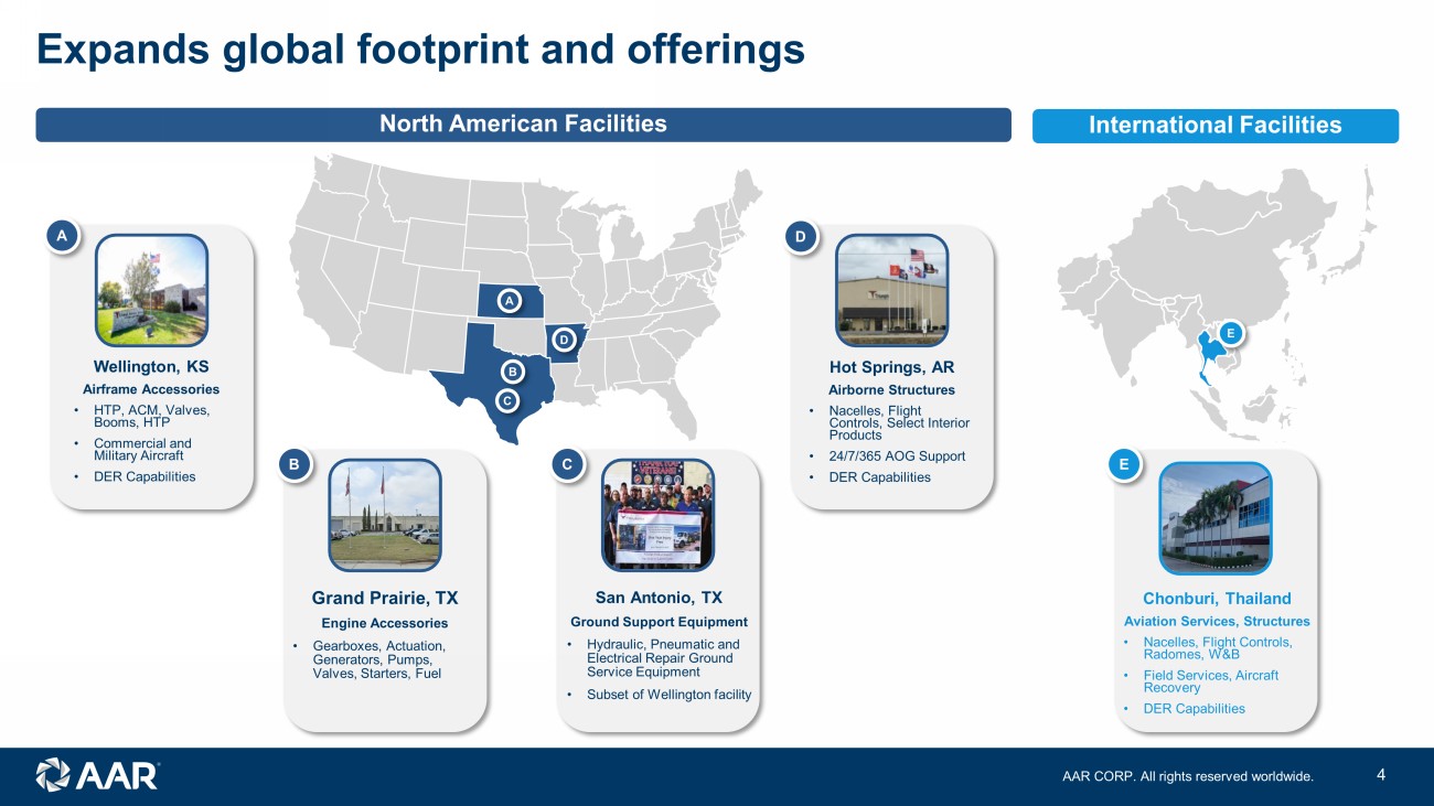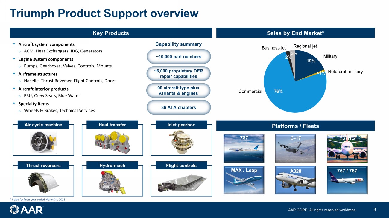 AAR CORP. All rights reserved worldwide. 2 Compelling acquisition of Triumph Product Support Strategic h ighlights: x Meaningfully scales AAR’s proprietary repair capabilities, highly complementary with existing portfolio x Significantly accretive to margins with highly attractive overall financial profile x Thailand facility enables significant expansion of operations and capabilities in APAC x Potential benefits of integrating AAR existing parts / trading / integrated solutions volumes with Product Support’s facilities and proprietary capabilities x Expected run - rate cost synergies of $10 million x Strong combined free cash flow Furthering AAR’s Connected Business Model