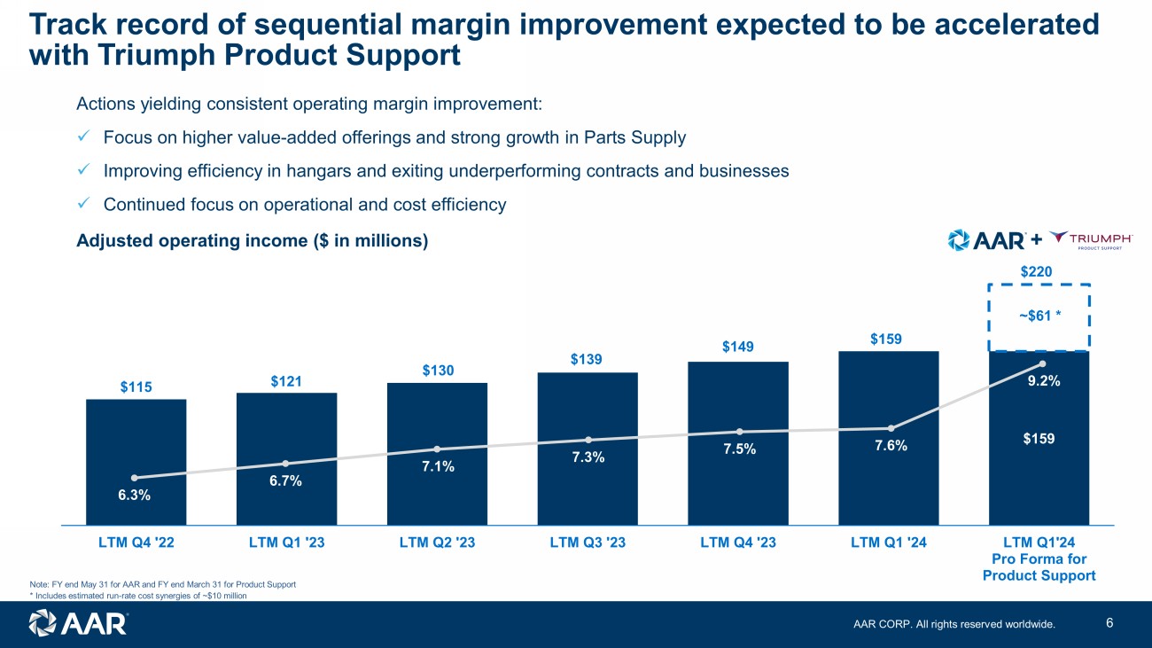 AAR CORP. All rights reserved worldwide. 5 Complementary capabilities unlocking compelling opportunities Enhanced ATA chapter coverage Expands PMA and DER portfolio and development capability Thailand facility as a hub to penetrate fast growing APAC AAR’s military expertise to accelerate Product Support’s military growth o Largest independent USM supplier globally o Asset sourcing / distribution capabilities o Airframe MRO / Landing Gear Overhaul / Component Repair o Strong government customer relationship o Trax and Airinmar – repair management capabilities o Deep technical capabilities in component repair across ATA chapters o Complete offering of structures and accessories o Parts Manufacturer Approval (PMA) capability o Catalog of ~6,000 proprietary DER repair capabilities o Extensive rotable pool