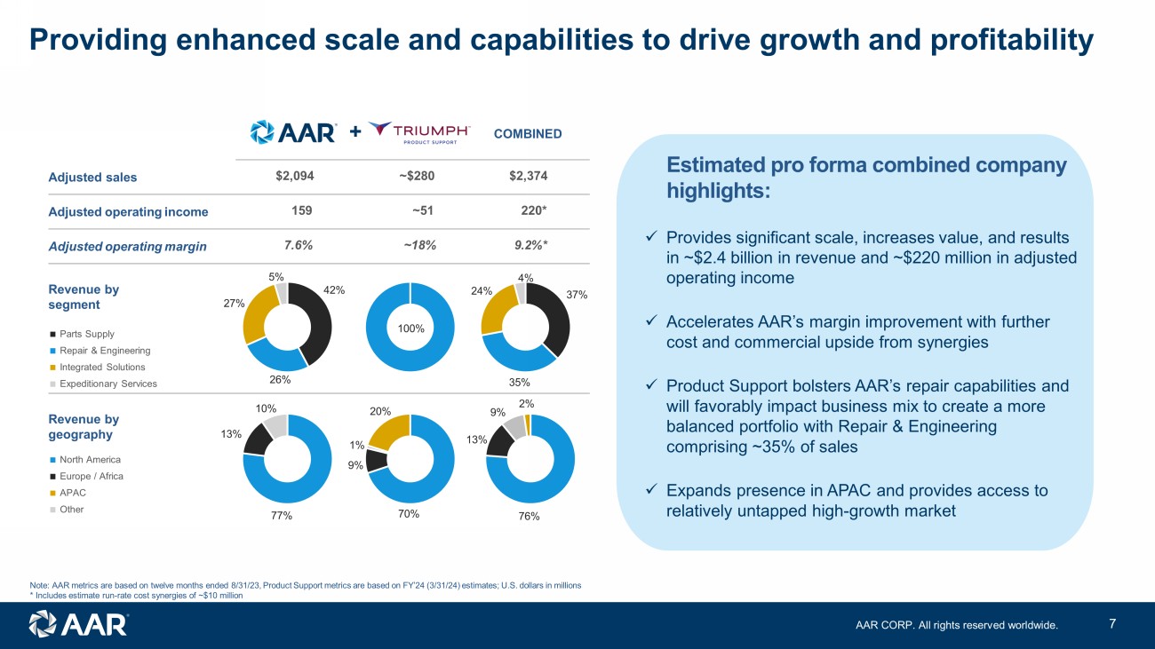 AAR CORP. All rights reserved worldwide. 6 $115 $121 $130 $139 $149 $159 $159 ~ $61 * LTM Q4 '22 LTM Q1 '23 LTM Q2 '23 LTM Q3 '23 LTM Q4 '23 LTM Q1 '24 LTM Q1'24 Pro Forma for Product Support 6.3% 6.7% 7.1% 7.3% 7.5% 7.6% 9.2% Track record of sequential margin improvement expected to be accelerated with Triumph Product Support Actions yielding consistent operating margin improvement: x Focus on higher value - added offerings and strong growth in Parts Supply x Improving efficiency in hangars and e xiting underperforming contracts and businesses x Continued focus on operational and cost efficiency Note: FY end May 31 for AAR and FY end March 31 for Product Support * Includes estimated run - rate cost synergies of ~$10 million Adjusted operating i ncome ($ in millions) $220 +