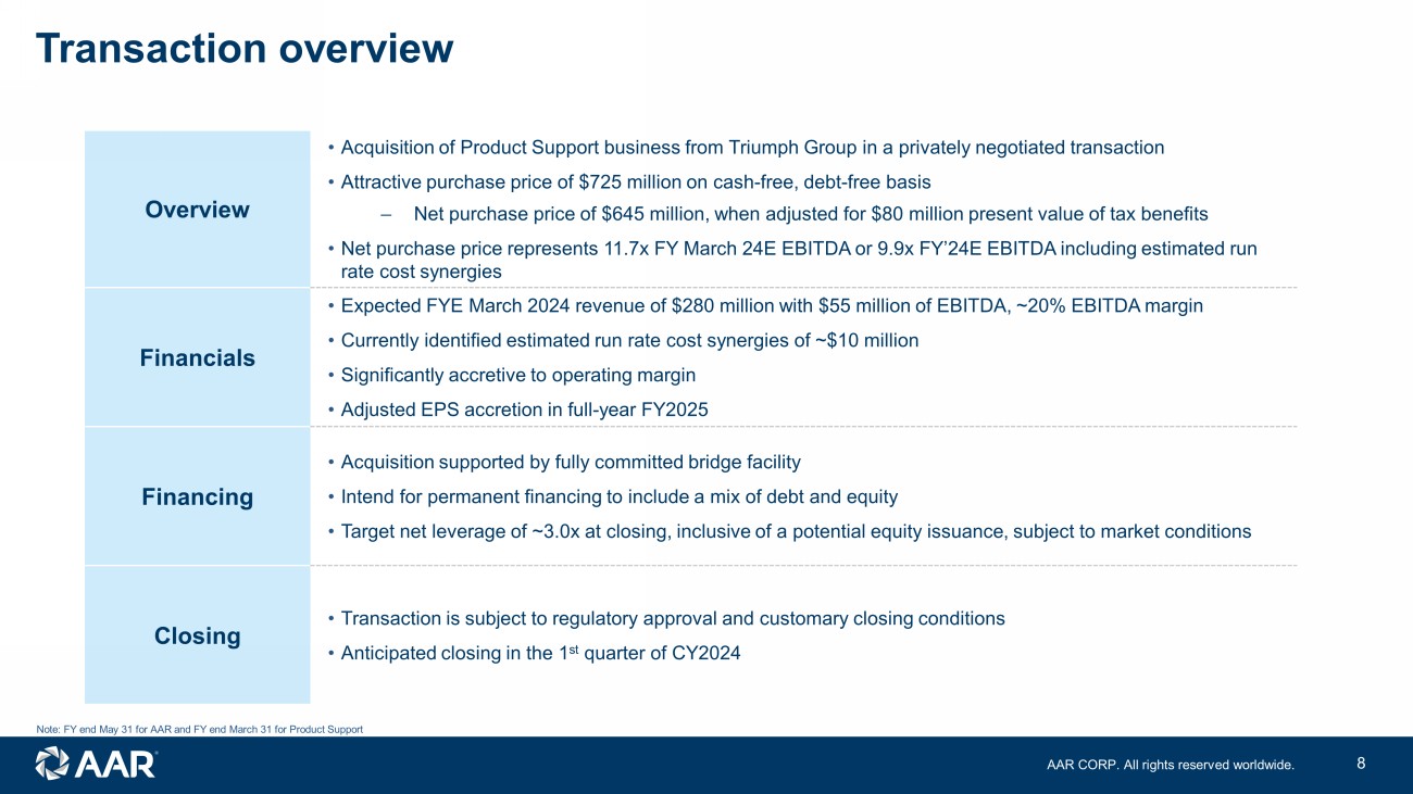 AAR CORP. All rights reserved worldwide. 7 Estimated pro forma c ombined c ompany h ighlights : x Provides significant scale, i ncreases value , and results in ~ $ 2.4 billion in revenue and ~$220 million in adjusted operating income x Accelerates AAR’s margin improvement with further cost and commercial upside from synergies x Product Support bolsters AAR’s repair capabilities and will favorably impact business mix to create a more balanced portfolio with Repair & Engineering comprising ~35% of sales x Expands presence in APAC and provides access to relatively untapped high - growth market 70% 9% 1% 20% COMBINED Adjusted sales $2,094 ~$280 $ 2,374 Adjusted operating income 159 ~51 220* Adjusted operating margin 7.6 % ~ 1 8 % 9.2 % * Revenue by segment Revenue by geography 37% 35% 24% 4% 100% Providing enhanced scale and capabilities to drive growth and profitability Note: AAR metrics are based on twelve months ended 8/31/23, Product Support metrics are based on FY’24 (3/31/24) estimates; U.S. dollars in millions * Includes estimate run - rate cost synergies of ~$10 million 76% 13% 9% 2% 42% 26% 27% 5% 77% 13% 10% + Parts Supply Repair & Engineering Integrated Solutions Expeditionary Services North America Europe / Africa APAC Other