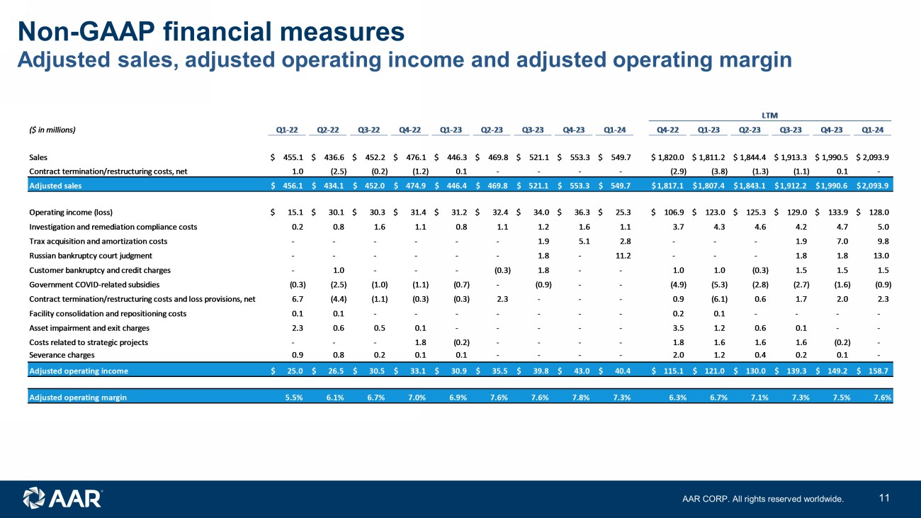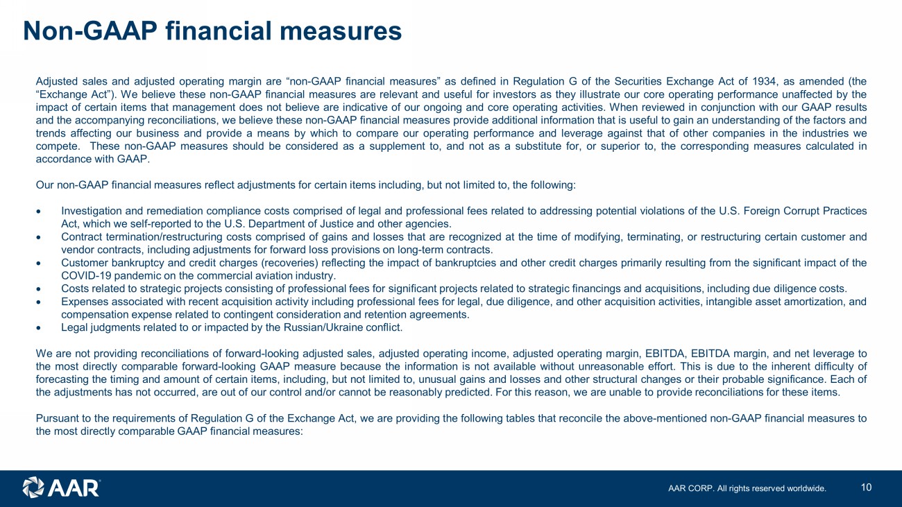 AAR CORP. All rights reserved worldwide. 10 Non - GAAP financial measures Adjusted sales and adjusted operating margin are “non - GAAP financial measures” as defined in Regulation G of the Securities Exchange Act of 1934 , as amended (the “Exchange Act”) . We believe these non - GAAP financial measures are relevant and useful for investors as they illustrate our core operating performance unaffected by the impact of certain items that management does not believe are indicative of our ongoing and core operating activities . When reviewed in conjunction with our GAAP results and the accompanying reconciliations, we believe these non - GAAP financial measures provide additional information that is useful to gain an understanding of the factors and trends affecting our business and provide a means by which to compare our operating performance and leverage against that of other companies in the industries we compete . These non - GAAP measures should be considered as a supplement to, and not as a substitute for, or superior to, the corresponding measures calculated in accordance with GAAP . Our non - GAAP financial measures reflect adjustments for certain items including, but not limited to, the following : Investigation and remediation compliance costs comprised of legal and professional fees related to addressing potential violations of the U . S . Foreign Corrupt Practices Act, which we self - reported to the U . S . Department of Justice and other agencies . Contract termination/restructuring costs comprised of gains and losses that are recognized at the time of modifying, terminating, or restructuring certain customer and vendor contracts, including adjustments for forward loss provisions on long - term contracts . Customer bankruptcy and credit charges (recoveries) reflecting the impact of bankruptcies and other credit charges primarily resulting from the significant impact of the COVID - 19 pandemic on the commercial aviation industry . Costs related to strategic projects consisting of professional fees for significant projects related to strategic financings and acquisitions, including due diligence costs . Expenses associated with recent acquisition activity including professional fees for legal, due diligence, and other acquisition activities, intangible asset amortization, and compensation expense related to contingent consideration and retention agreements . Legal judgments related to or impacted by the Russian/Ukraine conflict . We are not providing reconciliations of forward - looking adjusted sales, adjusted operating income, adjusted operating margin, EBITDA, EBITDA margin, and net leverage to the most directly comparable forward - looking GAAP measure because the information is not available without unreasonable effort . This is due to the inherent difficulty of forecasting the timing and amount of certain items, including, but not limited to, unusual gains and losses and other structural changes or their probable significance . Each of the adjustments has not occurred, are out of our control and/or cannot be reasonably predicted . For this reason, we are unable to provide reconciliations for these items . Pursuant to the requirements of Regulation G of the Exchange Act, we are providing the following tables that reconcile the above - mentioned non - GAAP financial measures to the most directly comparable GAAP financial measures :