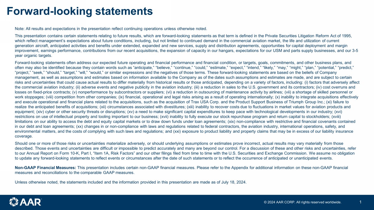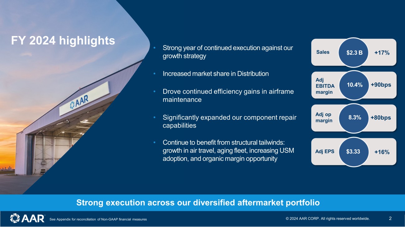 Forward - looking statements Note: All results and expectations in the presentation reflect continuing operations unless otherwise noted. This presentation contains certain statements relating to future results, which are forward - looking statements as that term is d efined in the Private Securities Litigation Reform Act of 1995, which reflect management’s expectations about future conditions, including, but not limited to continued demand in the commer cia l aviation market, the life and utilization of current generation aircraft, anticipated activities and benefits under extended, expanded and new services, supply and distribution a gre ements, opportunities for capital deployment and margin improvement, earnings performance, contributions from our recent acquisitions, the expansion of capacity in our hangars, expe cta tions for our USM and parts supply businesses, and our 3 - 5 year organic targets. Forward - looking statements often address our expected future operating and financial performance and financial condition, or tar gets, goals, commitments, and other business plans, and often may also be identified because they contain words such as “anticipate,” “believe,” “continue,” “could,” “estimate,” “ex pec t,” “intend,” “likely,” “may,” “might,” “plan,” “potential,” “predict,” “project,” “seek,” “should,” “target,” “will,” “would,” or similar expressions and the negatives of those terms. These forward - looking statements are based on the beliefs of Company management, as well as assumptions and estimates based on information available to the Company as of the dates such assumptio ns and estimates are made, and are subject to certain risks and uncertainties that could cause actual results to differ materially from historical results or those anticipated, de pen ding on a variety of factors, including: ( i ) factors that adversely affect the commercial aviation industry; (ii) adverse events and negative publicity in the aviation industry; (iii) a reduction in s ale s to the U.S. government and its contractors; (iv) cost overruns and losses on fixed - price contracts; (v) nonperformance by subcontractors or suppliers; (vi) a reduction in outsourcing of maintenan ce activity by airlines; (vii) a shortage of skilled personnel or work stoppages; (viii) competition from other companies; (ix) financial, operational and legal risks arising as a result of o per ating internationally; (x) inability to integrate acquisitions effectively and execute operational and financial plans related to the acquisitions, such as the acquisition of Trax USA Corp. and the Product Support Business of Triumph Group Inc. ; (xi) failure to realize the anticipated benefits of acquisitions; (xii) circumstances associated with divestitures; (xiii) inability to recov er costs due to fluctuations in market values for aviation products and equipment; (xiv) cyber or other security threats or disruptions; (xv) a need to make significant capital expenditures to keep pa ce with technological developments in our industry; (xvi) restrictions on use of intellectual property and tooling important to our business; (xvii) inability to fully execute our sto ck repurchase program and return capital to stockholders; (xviii) limitations on our ability to access the debt and equity capital markets or to draw down funds under loan agreements; (xix) n on - compliance with restrictive and financial covenants contained in our debt and loan agreements; (xx) changes in or non - compliance with laws and regulations related to federal contractors, the aviation industry, international operations, safety, and environmental matters, and the costs of complying with such laws and regulations; and (xxi) exposure to product liability and pr operty claims that may be in excess of our liability insurance coverage. Should one or more of those risks or uncertainties materialize adversely, or should underlying assumptions or estimates prove in correct, actual results may vary materially from those described. Those events and uncertainties are difficult or impossible to predict accurately and many are beyond our control. For a discussion of these and other risks and uncertainties, refer to our Annual Report on Form 10 - K, Part I, “Item 1A, Risk Factors” and our other filings filed from time to time with the U.S. S ecurities and Exchange Commission. We assume no obligation to update any forward - looking statements to reflect events or circumstances after the date of such statements or to reflect the occurrence of anticipated or unanticipated events. Non - GAAP Financial Measures: This presentation includes certain non - GAAP financial measures. Please refer to the Appendix for additional information on these non - GAAP financial measures and reconciliations to the comparable GAAP measures. Unless otherwise noted, the statements included and the information provided in this presentation are made as of July 18, 202 4. © 202 4 AAR CORP. All rights reserved worldwide. 1