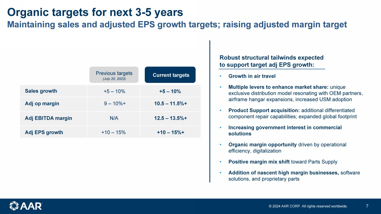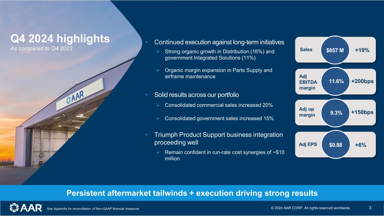 FY 2024 highlights See Appendix for reconciliation of Non - GAAP financial measures • Strong year of continued execution against our growth strategy • Increased market share in Distribution • Drove continued efficiency gains in airframe maintenance • Significantly expanded our component repair capabilities • Continue to benefit from structural tailwinds: growth in air travel, aging fleet, increasing USM adoption, and organic margin opportunity Sales $2.3 B +17% Adj op margin 8.3% +80bps Adj EPS $3.33 +16% Strong execution across our diversified aftermarket portfolio Adj EBITDA margin +90bps 10.4% © 202 4 AAR CORP. All rights reserved worldwide. 2