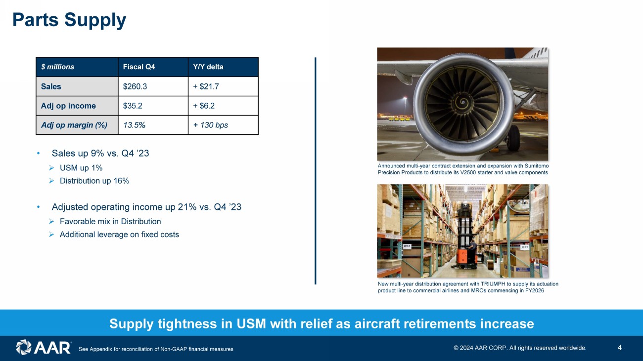 Q4 2024 highlights As compared to Q4 2023 • Continued execution against long - term initiatives • Solid results across our portfolio • Triumph Product Support business integration proceeding well Sales $657 M +19% Adj op margin 9.3% +150bps Adj EPS $0.88 +6% » Strong organic growth in Distribution (16%) and government Integrated Solutions (11%) » Organic margin expansion in Parts Supply and airframe maintenance » Remain confident in run - rate cost synergies of ~$10 million Persistent aftermarket tailwinds + execution driving strong results » Consolidated commercial sales increased 20% » Consolidated government sales increased 15% Adj EBITDA margin 11.6% +200bps See Appendix for reconciliation of Non - GAAP financial measures © 202 4 AAR CORP. All rights reserved worldwide. 3