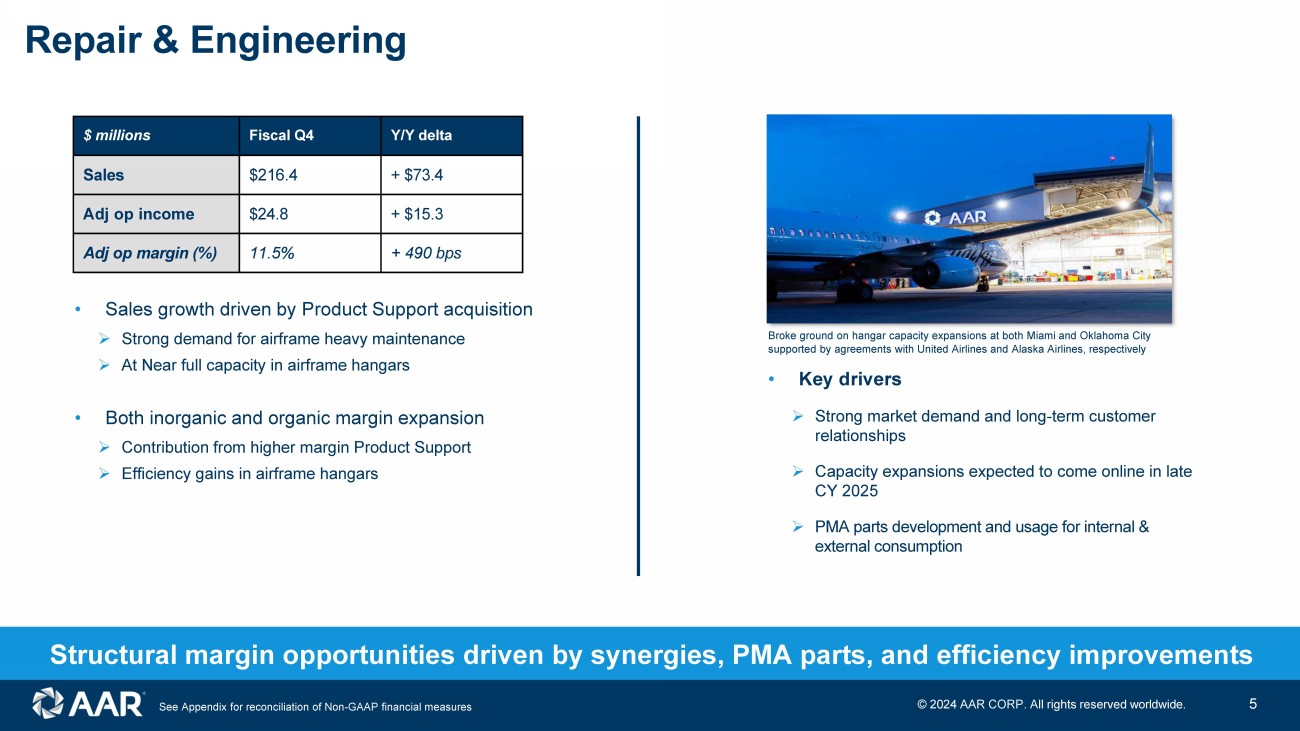 • Sales up 9% vs. Q4 ’23 » USM up 1 % » Distribution up 16% • Adjusted operating income up 21% vs. Q4 ’23 » Favorable mix in Distribution » Additional leverage on fixed costs Parts Supply $ millions Fiscal Q4 Y / Y delta Sales $260.3 + $21.7 Adj op income $35.2 + $6.2 Adj op margin (%) 13 . 5 % + 130 bps Announced multi - year contract extension and expansion with Sumitomo Precision Products to distribute its V2500 starter and valve components 4 Continued supply tightness in USM with relief as aircraft retirements increase New multi - year distribution agreement with TRIUMPH to supply its actuation product line to commercial airlines and MROs commencing in FY2026 See Appendix for reconciliation of Non - GAAP financial measures © 202 4 AAR CORP. All rights reserved worldwide.