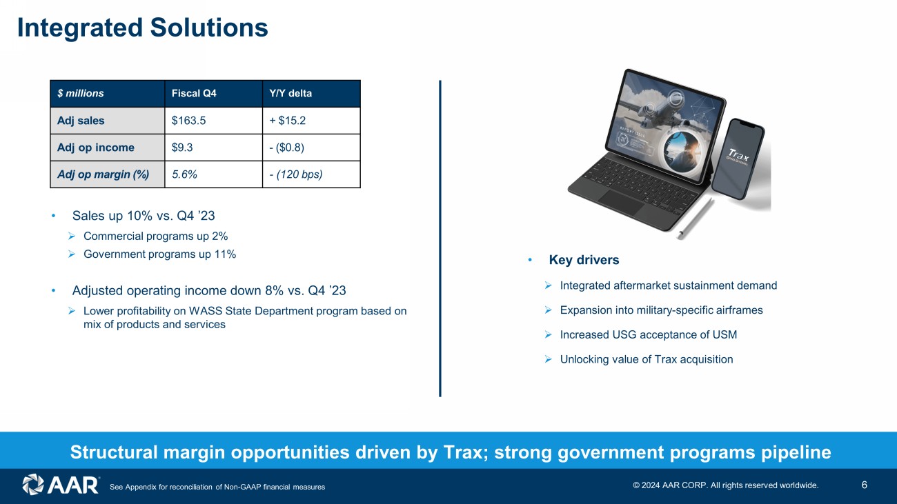 • Sales growth driven by Product Support acquisition » Strong demand for airframe heavy maintenance » At full capacity in airframe hangars • Both inorganic and organic margin expansion » Contribution from higher margin Product Support » Efficiency gains in airframe hangars Repair & Engineering Broke ground on hangar capacity expansions at both Miami and Oklahoma City supported by agreements with United Airlines and Alaska Airlines, respectively 5 Structural margin opportunities driven by synergies, PMA parts, and efficiency improvements • Key drivers » Strong market demand and long - term customer relationships » Capacity expansions expected to come online in late CY 2025 » PMA parts development and usage for internal & external consumption $ millions Fiscal Q4 Y / Y delta Sales $216.4 + $73.4 Adj o p income $24.8 + $15.3 Adj op margin (%) 11 . 5 % + 490 bps See Appendix for reconciliation of Non - GAAP financial measures © 202 4 AAR CORP. All rights reserved worldwide.