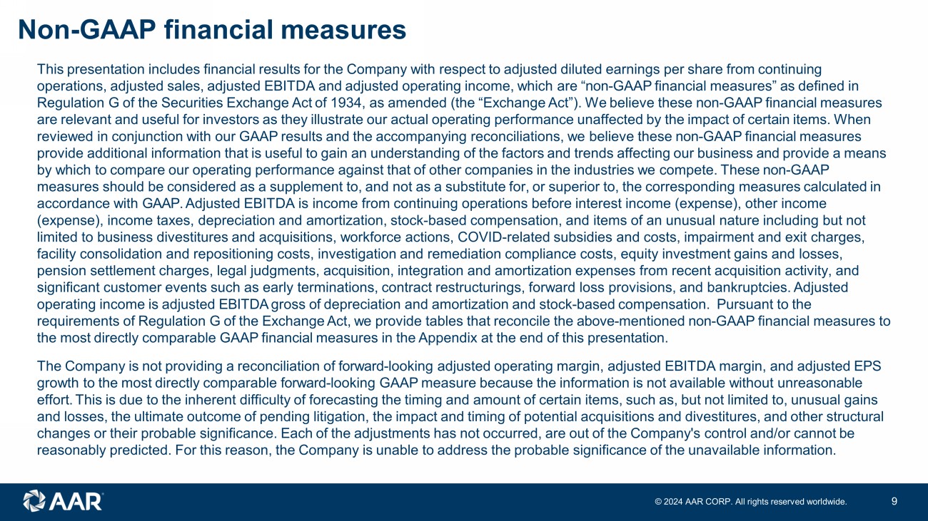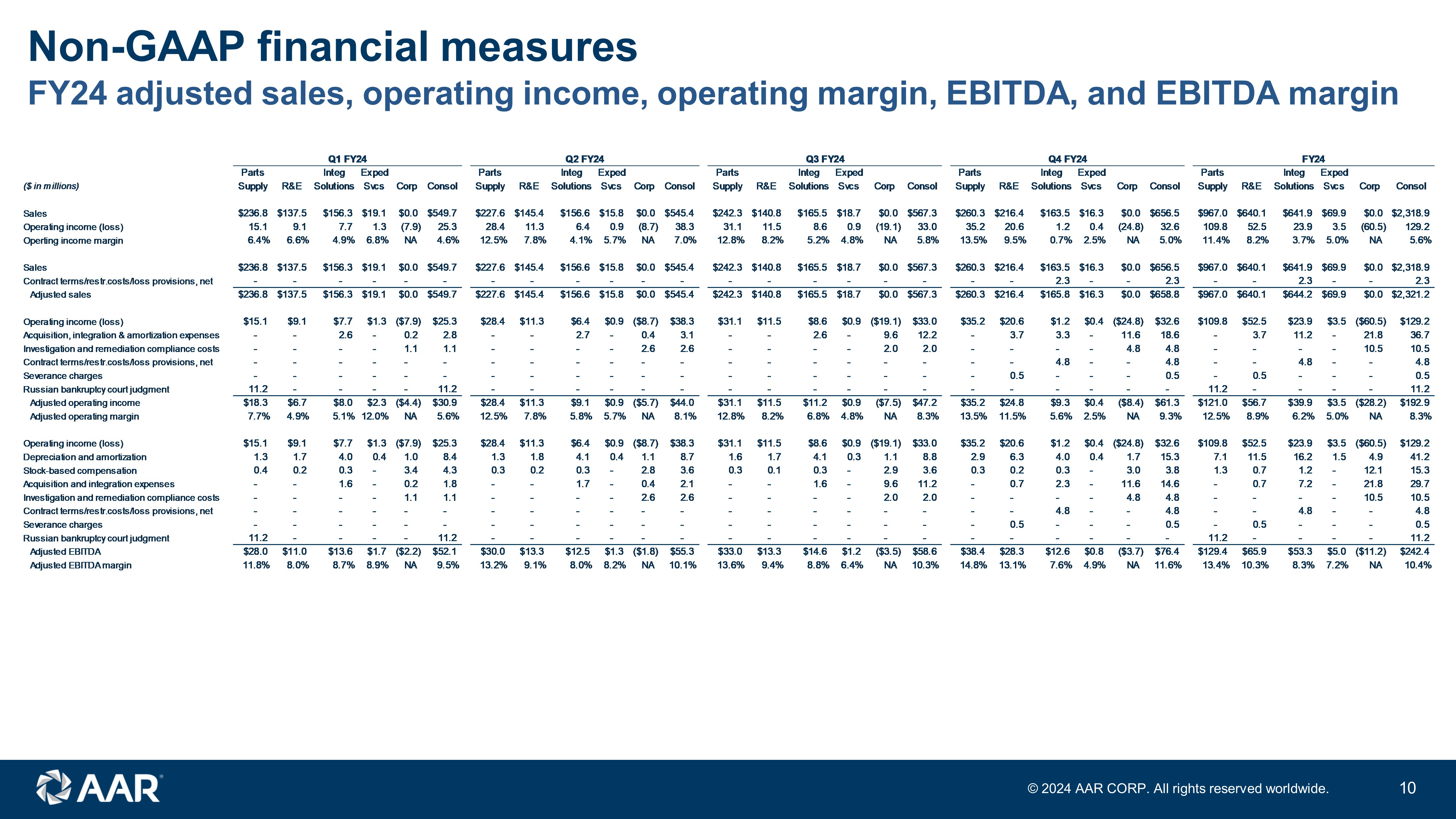 Non - GAAP financial measures This presentation includes financial results for the Company with respect to adjusted diluted earnings per share from continuing operations, adjusted sales, adjusted EBITDA and adjusted operating income, which are “non - GAAP financial measures” as defined in Regulation G of the Securities Exchange Act of 1934, as amended (the “Exchange Act”). We believe these non - GAAP financial measures are relevant and useful for investors as they illustrate our actual operating performance unaffected by the impact of certain items. When reviewed in conjunction with our GAAP results and the accompanying reconciliations, we believe these non - GAAP financial measures provide additional information that is useful to gain an understanding of the factors and trends affecting our business and provide a means by which to compare our operating performance against that of other companies in the industries we compete. These non - GAAP measures should be considered as a supplement to, and not as a substitute for, or superior to, the corresponding measures calculated in accordance with GAAP. Adjusted EBITDA is income from continuing operations before interest income (expense), other income (expense), income taxes, depreciation and amortization, stock - based compensation, and items of an unusual nature including but n ot limited to business divestitures and acquisitions, workforce actions, COVID - related subsidies and costs, impairment and exit cha rges, facility consolidation and repositioning costs, investigation and remediation compliance costs, equity investment gains and l oss es, pension settlement charges, legal judgments, acquisition, integration and amortization expenses from recent acquisition activ ity , and significant customer events such as early terminations, contract restructurings, forward loss provisions, and bankruptcies. Adjusted operating income is adjusted EBITDA gross of depreciation and amortization and stock - based compensation. Pursuant to the requirements of Regulation G of the Exchange Act, we provide tables that reconcile the above - mentioned non - GAAP financial measures to the most directly comparable GAAP financial measures in the Appendix at the end of this presentation. The Company is not providing a reconciliation of forward - looking adjusted operating margin , adjusted EBITDA margin, and adjusted EPS growth to the most directly comparable forward - looking GAAP measure because the information is not available without unreasonable effort. This is due to the inherent difficulty of forecasting the timing and amount of certain items, such as, but not limited to, unusual gains and losses, the ultimate outcome of pending litigation, the impact and timing of potential acquisitions and divestitures, and other structural changes or their probable significance. Each of the adjustments has not occurred, are out of the Company's control and/or cannot be reasonably predicted. For this reason, the Company is unable to address the probable significance of the unavailable information. 9 © 202 4 AAR CORP. All rights reserved worldwide.