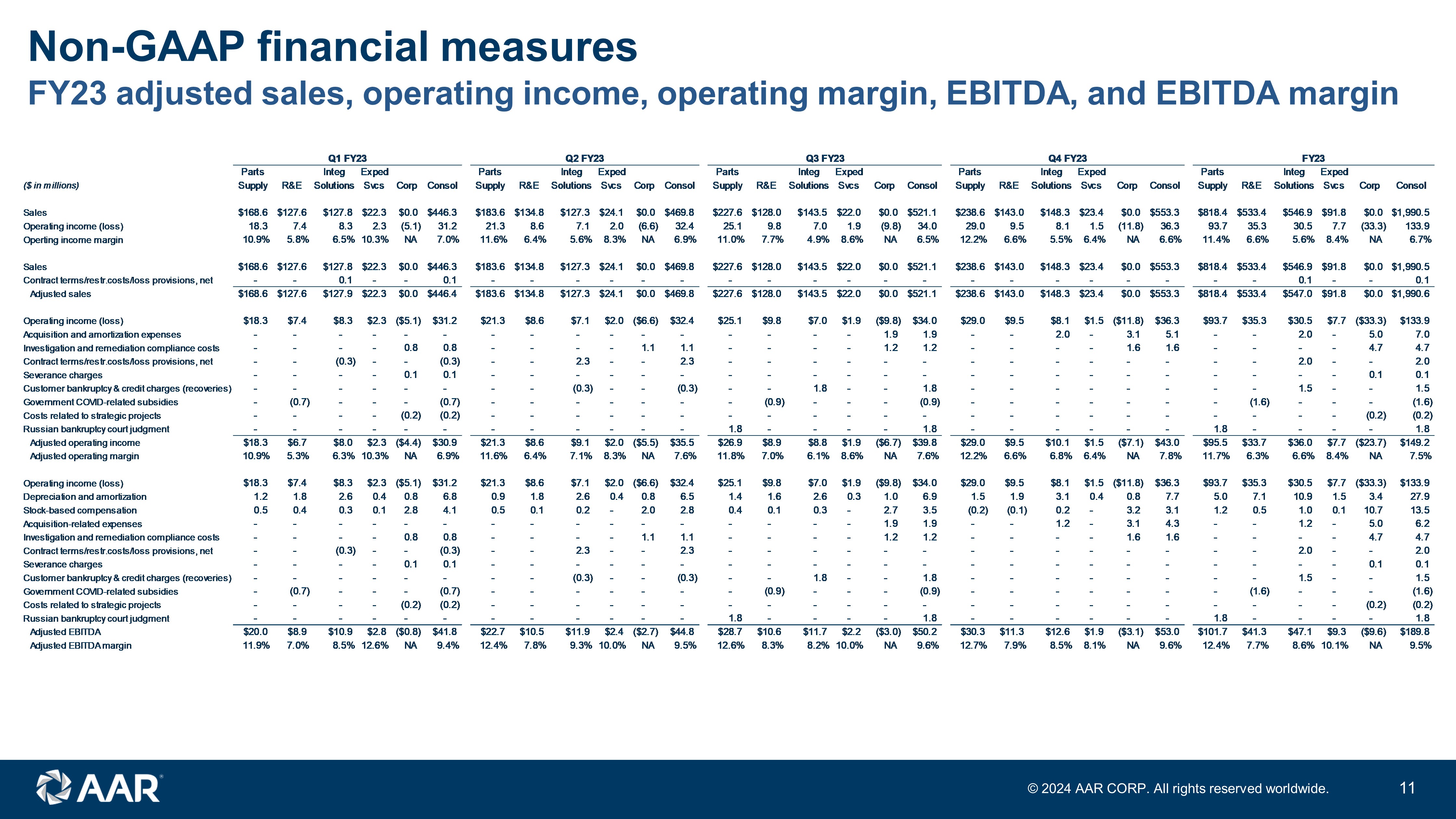 Non - GAAP financial measures FY24 adjusted sales, operating income, operating margin, EBITDA, and EBITDA margin 10 © 202 4 AAR CORP. All rights reserved worldwide. Q1 FY24 Q2 FY24 Q3 FY24 Q4 FY24 FY24 Parts Integ Exped Parts Integ Exped Parts Integ Exped Parts Integ Exped Parts Integ Exped ($ in millions) Supply R&E Solutions Svcs Corp Consol Supply R&E Solutions Svcs Corp Consol Supply R&E Solutions Svcs Corp Consol Supply R&E Solutions Svcs Corp Consol Supply R&E Solutions Svcs Corp Consol Sales $236.8 $137.5 $156.3 $19.1 $0.0 $549.7 $227.6 $145.4 $156.6 $15.8 $0.0 $545.4 $242.3 $140.8 $165.5 $18.7 $0.0 $567.3 $260.3 $216.4 $163.5 $16.3 $0.0 $656.5 $967.0 $640.1 $641.9 $69.9 $0.0 $2,318.9 Operating income (loss) 15.1 9.1 7.7 1.3 (7.9) 25.3 28.4 11.3 6.4 0.9 (8.7) 38.3 31.1 11.5 8.6 0.9 (19.1) 33.0 35.2 20.6 1.2 0.4 (24.8) 32.6 109.8 52.5 23.9 3.5 (60.5) 129.2 Operting income margin 6.4% 6.6% 4.9% 6.8% NA 4.6% 12.5% 7.8% 4.1% 5.7% NA 7.0% 12.8% 8.2% 5.2% 4.8% NA 5.8% 13.5% 9.5% 0.7% 2.5% NA 5.0% 11.4% 8.2% 3.7% 5.0% NA 5.6% Sales $236.8 $137.5 $156.3 $19.1 $0.0 $549.7 $227.6 $145.4 $156.6 $15.8 $0.0 $545.4 $242.3 $140.8 $165.5 $18.7 $0.0 $567.3 $260.3 $216.4 $163.5 $16.3 $0.0 $656.5 $967.0 $640.1 $641.9 $69.9 $0.0 $2,318.9 Contract terms/restr.costs/loss provisions, net - - - - - - - - - - - - - - - - - - - - 2.3 - - 2.3 - - 2.3 - - 2.3 Adjusted sales $236.8 $137.5 $156.3 $19.1 $0.0 $549.7 $227.6 $145.4 $156.6 $15.8 $0.0 $545.4 $242.3 $140.8 $165.5 $18.7 $0.0 $567.3 $260.3 $216.4 $165.8 $16.3 $0.0 $658.8 $967.0 $640.1 $644.2 $69.9 $0.0 $2,321.2 Operating income (loss) $15.1 $9.1 $7.7 $1.3 ($7.9) $25.3 $28.4 $11.3 $6.4 $0.9 ($8.7) $38.3 $31.1 $11.5 $8.6 $0.9 ($19.1) $33.0 $35.2 $20.6 $1.2 $0.4 ($24.8) $32.6 $109.8 $52.5 $23.9 $3.5 ($60.5) $129.2 Acquisition, integration & amortization expenses - - 2.6 - 0.2 2.8 - - 2.7 - 0.4 3.1 - - 2.6 - 9.6 12.2 - 3.7 3.3 - 11.6 18.6 - 3.7 11.2 - 21.8 36.7 Investigation and remediation compliance costs - - - - 1.1 1.1 - - - - 2.6 2.6 - - - - 2.0 2.0 - - - - 4.8 4.8 - - - - 10.5 10.5 Contract terms/restr.costs/loss provisions, net - - - - - - - - - - - - - - - - - - - - 4.8 - - 4.8 - - 4.8 - - 4.8 Severance charges - - - - - - - - - - - - - - - - - - - 0.5 - - - 0.5 - 0.5 - - - 0.5 Russian bankruptcy court judgment 11.2 - - - - 11.2 - - - - - - - - - - - - - - - - - - 11.2 - - - - 11.2 Adjusted operating income $18.3 $6.7 $8.0 $2.3 ($4.4) $30.9 $28.4 $11.3 $9.1 $0.9 ($5.7) $44.0 $31.1 $11.5 $11.2 $0.9 ($7.5) $47.2 $35.2 $24.8 $9.3 $0.4 ($8.4) $61.3 $121.0 $56.7 $39.9 $3.5 ($28.2) $192.9 Adjusted operating margin 7.7% 4.9% 5.1% 12.0% NA 5.6% 12.5% 7.8% 5.8% 5.7% NA 8.1% 12.8% 8.2% 6.8% 4.8% NA 8.3% 13.5% 11.5% 5.6% 2.5% NA 9.3% 12.5% 8.9% 6.2% 5.0% NA 8.3% Operating income (loss) $15.1 $9.1 $7.7 $1.3 ($7.9) $25.3 $28.4 $11.3 $6.4 $0.9 ($8.7) $38.3 $31.1 $11.5 $8.6 $0.9 ($19.1) $33.0 $35.2 $20.6 $1.2 $0.4 ($24.8) $32.6 $109.8 $52.5 $23.9 $3.5 ($60.5) $129.2 Depreciation and amortization 1.3 1.7 4.0 0.4 1.0 8.4 1.3 1.8 4.1 0.4 1.1 8.7 1.6 1.7 4.1 0.3 1.1 8.8 2.9 6.3 4.0 0.4 1.7 15.3 7.1 11.5 16.2 1.5 4.9 41.2 Stock-based compensation 0.4 0.2 0.3 - 3.4 4.3 0.3 0.2 0.3 - 2.8 3.6 0.3 0.1 0.3 - 2.9 3.6 0.3 0.2 0.3 - 3.0 3.8 1.3 0.7 1.2 - 12.1 15.3 Acquisition and integration expenses - - 1.6 - 0.2 1.8 - - 1.7 - 0.4 2.1 - - 1.6 - 9.6 11.2 - 0.7 2.3 - 11.6 14.6 - 0.7 7.2 - 21.8 29.7 Investigation and remediation compliance costs - - - - 1.1 1.1 - - - - 2.6 2.6 - - - - 2.0 2.0 - - - - 4.8 4.8 - - - - 10.5 10.5 Contract terms/restr.costs/loss provisions, net - - - - - - - - - - - - - - - - - - - - 4.8 - - 4.8 - - 4.8 - - 4.8 Severance charges - - - - - - - - - - - - - - - - - - - 0.5 - - - 0.5 - 0.5 - - - 0.5 Russian bankruptcy court judgment 11.2 - - - - 11.2 - - - - - - - - - - - - - - - - - - 11.2 - - - - 11.2 Adjusted EBITDA $28.0 $11.0 $13.6 $1.7 ($2.2) $52.1 $30.0 $13.3 $12.5 $1.3 ($1.8) $55.3 $33.0 $13.3 $14.6 $1.2 ($3.5) $58.6 $38.4 $28.3 $12.6 $0.8 ($3.7) $76.4 $129.4 $65.9 $53.3 $5.0 ($11.2) $242.4 Adjusted EBITDA margin 11.8% 8.0% 8.7% 8.9% NA 9.5% 13.2% 9.1% 8.0% 8.2% NA 10.1% 13.6% 9.4% 8.8% 6.4% NA 10.3% 14.8% 13.1% 7.6% 4.9% NA 11.6% 13.4% 10.3% 8.3% 7.2% NA 10.4%