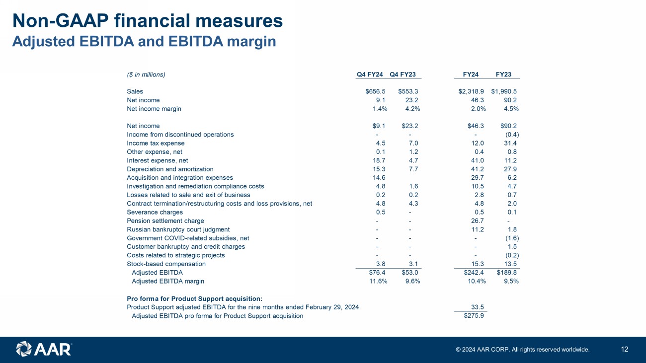 Non - GAAP financial measures FY23 adjusted sales, operating income, operating margin, EBITDA, and EBITDA margin 11 © 202 4 AAR CORP. All rights reserved worldwide. Q1 FY23 Q2 FY23 Q3 FY23 Q4 FY23 FY23 Parts Integ Exped Parts Integ Exped Parts Integ Exped Parts Integ Exped Parts Integ Exped ($ in millions) Supply R&E Solutions Svcs Corp Consol Supply R&E Solutions Svcs Corp Consol Supply R&E Solutions Svcs Corp Consol Supply R&E Solutions Svcs Corp Consol Supply R&E Solutions Svcs Corp Consol Sales $168.6 $127.6 $127.8 $22.3 $0.0 $446.3 $183.6 $134.8 $127.3 $24.1 $0.0 $469.8 $227.6 $128.0 $143.5 $22.0 $0.0 $521.1 $238.6 $143.0 $148.3 $23.4 $0.0 $553.3 $818.4 $533.4 $546.9 $91.8 $0.0 $1,990.5 Operating income (loss) 18.3 7.4 8.3 2.3 (5.1) 31.2 21.3 8.6 7.1 2.0 (6.6) 32.4 25.1 9.8 7.0 1.9 (9.8) 34.0 29.0 9.5 8.1 1.5 (11.8) 36.3 93.7 35.3 30.5 7.7 (33.3) 133.9 Operting income margin 10.9% 5.8% 6.5% 10.3% NA 7.0% 11.6% 6.4% 5.6% 8.3% NA 6.9% 11.0% 7.7% 4.9% 8.6% NA 6.5% 12.2% 6.6% 5.5% 6.4% NA 6.6% 11.4% 6.6% 5.6% 8.4% NA 6.7% Sales $168.6 $127.6 $127.8 $22.3 $0.0 $446.3 $183.6 $134.8 $127.3 $24.1 $0.0 $469.8 $227.6 $128.0 $143.5 $22.0 $0.0 $521.1 $238.6 $143.0 $148.3 $23.4 $0.0 $553.3 $818.4 $533.4 $546.9 $91.8 $0.0 $1,990.5 Contract terms/restr.costs/loss provisions, net - - 0.1 - - 0.1 - - - - - - - - - - - - - - - - - - - - 0.1 - - 0.1 Adjusted sales $168.6 $127.6 $127.9 $22.3 $0.0 $446.4 $183.6 $134.8 $127.3 $24.1 $0.0 $469.8 $227.6 $128.0 $143.5 $22.0 $0.0 $521.1 $238.6 $143.0 $148.3 $23.4 $0.0 $553.3 $818.4 $533.4 $547.0 $91.8 $0.0 $1,990.6 Operating income (loss) $18.3 $7.4 $8.3 $2.3 ($5.1) $31.2 $21.3 $8.6 $7.1 $2.0 ($6.6) $32.4 $25.1 $9.8 $7.0 $1.9 ($9.8) $34.0 $29.0 $9.5 $8.1 $1.5 ($11.8) $36.3 $93.7 $35.3 $30.5 $7.7 ($33.3) $133.9 Acquisition and amortization expenses - - - - - - - - - - - - - - - - 1.9 1.9 - - 2.0 - 3.1 5.1 - - 2.0 - 5.0 7.0 Investigation and remediation compliance costs - - - - 0.8 0.8 - - - - 1.1 1.1 - - - - 1.2 1.2 - - - - 1.6 1.6 - - - - 4.7 4.7 Contract terms/restr.costs/loss provisions, net - - (0.3) - - (0.3) - - 2.3 - - 2.3 - - - - - - - - - - - - - - 2.0 - - 2.0 Severance charges - - - - 0.1 0.1 - - - - - - - - - - - - - - - - - - - - - - 0.1 0.1 Customer bankruptcy & credit charges (recoveries) - - - - - - - - (0.3) - - (0.3) - - 1.8 - - 1.8 - - - - - - - - 1.5 - - 1.5 Government COVID-related subsidies - (0.7) - - - (0.7) - - - - - - - (0.9) - - - (0.9) - - - - - - - (1.6) - - - (1.6) Costs related to strategic projects - - - - (0.2) (0.2) - - - - - - - - - - - - - - - - - - - - - - (0.2) (0.2) Russian bankruptcy court judgment - - - - - - - - - - - - 1.8 - - - - 1.8 - - - - - - 1.8 - - - - 1.8 Adjusted operating income $18.3 $6.7 $8.0 $2.3 ($4.4) $30.9 $21.3 $8.6 $9.1 $2.0 ($5.5) $35.5 $26.9 $8.9 $8.8 $1.9 ($6.7) $39.8 $29.0 $9.5 $10.1 $1.5 ($7.1) $43.0 $95.5 $33.7 $36.0 $7.7 ($23.7) $149.2 Adjusted operating margin 10.9% 5.3% 6.3% 10.3% NA 6.9% 11.6% 6.4% 7.1% 8.3% NA 7.6% 11.8% 7.0% 6.1% 8.6% NA 7.6% 12.2% 6.6% 6.8% 6.4% NA 7.8% 11.7% 6.3% 6.6% 8.4% NA 7.5% Operating income (loss) $18.3 $7.4 $8.3 $2.3 ($5.1) $31.2 $21.3 $8.6 $7.1 $2.0 ($6.6) $32.4 $25.1 $9.8 $7.0 $1.9 ($9.8) $34.0 $29.0 $9.5 $8.1 $1.5 ($11.8) $36.3 $93.7 $35.3 $30.5 $7.7 ($33.3) $133.9 Depreciation and amortization 1.2 1.8 2.6 0.4 0.8 6.8 0.9 1.8 2.6 0.4 0.8 6.5 1.4 1.6 2.6 0.3 1.0 6.9 1.5 1.9 3.1 0.4 0.8 7.7 5.0 7.1 10.9 1.5 3.4 27.9 Stock-based compensation 0.5 0.4 0.3 0.1 2.8 4.1 0.5 0.1 0.2 - 2.0 2.8 0.4 0.1 0.3 - 2.7 3.5 (0.2) (0.1) 0.2 - 3.2 3.1 1.2 0.5 1.0 0.1 10.7 13.5 Acquisition-related expenses - - - - - - - - - - - - - - - - 1.9 1.9 - - 1.2 - 3.1 4.3 - - 1.2 - 5.0 6.2 Investigation and remediation compliance costs - - - - 0.8 0.8 - - - - 1.1 1.1 - - - - 1.2 1.2 - - - - 1.6 1.6 - - - - 4.7 4.7 Contract terms/restr.costs/loss provisions, net - - (0.3) - - (0.3) - - 2.3 - - 2.3 - - - - - - - - - - - - - - 2.0 - - 2.0 Severance charges - - - - 0.1 0.1 - - - - - - - - - - - - - - - - - - - - - - 0.1 0.1 Customer bankruptcy & credit charges (recoveries) - - - - - - - - (0.3) - - (0.3) - - 1.8 - - 1.8 - - - - - - - - 1.5 - - 1.5 Government COVID-related subsidies - (0.7) - - - (0.7) - - - - - - - (0.9) - - - (0.9) - - - - - - - (1.6) - - - (1.6) Costs related to strategic projects - - - - (0.2) (0.2) - - - - - - - - - - - - - - - - - - - - - - (0.2) (0.2) Russian bankruptcy court judgment - - - - - - - - - - - - 1.8 - - - - 1.8 - - - - - - 1.8 - - - - 1.8 Adjusted EBITDA $20.0 $8.9 $10.9 $2.8 ($0.8) $41.8 $22.7 $10.5 $11.9 $2.4 ($2.7) $44.8 $28.7 $10.6 $11.7 $2.2 ($3.0) $50.2 $30.3 $11.3 $12.6 $1.9 ($3.1) $53.0 $101.7 $41.3 $47.1 $9.3 ($9.6) $189.8 Adjusted EBITDA margin 11.9% 7.0% 8.5% 12.6% NA 9.4% 12.4% 7.8% 9.3% 10.0% NA 9.5% 12.6% 8.3% 8.2% 10.0% NA 9.6% 12.7% 7.9% 8.5% 8.1% NA 9.6% 12.4% 7.7% 8.6% 10.1% NA 9.5%