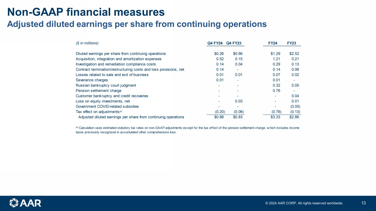 Non - GAAP financial measures Adjusted EBITDA and EBITDA margin 12 © 202 4 AAR CORP. All rights reserved worldwide. ($ in millions) Q4 FY24 Q4 FY23 FY24 FY23 Sales $656.5 $553.3 $2,318.9 $1,990.5 Net income 9.1 23.2 46.3 90.2 Net income margin 1.4% 4.2% 2.0% 4.5% Net income $9.1 $23.2 $46.3 $90.2 Income from discontinued operations - - - (0.4) Income tax expense 4.5 7.0 12.0 31.4 Other expense, net 0.1 1.2 0.4 0.8 Interest expense, net 18.7 4.7 41.0 11.2 Depreciation and amortization 15.3 7.7 41.2 27.9 Acquisition and integration expenses 14.6 29.7 6.2 Investigation and remediation compliance costs 4.8 1.6 10.5 4.7 Losses related to sale and exit of business 0.2 0.2 2.8 0.7 Contract termination/restructuring costs and loss provisions, net 4.8 4.3 4.8 2.0 Severance charges 0.5 - 0.5 0.1 Pension settlement charge - - 26.7 - Russian bankruptcy court judgment - - 11.2 1.8 Government COVID-related subsidies, net - - - (1.6) Customer bankruptcy and credit charges - - - 1.5 Costs related to strategic projects - - - (0.2) Stock-based compensation 3.8 3.1 15.3 13.5 Adjusted EBITDA $76.4 $53.0 $242.4 $189.8 Adjusted EBITDA margin 11.6% 9.6% 10.4% 9.5% Pro forma for Product Support acquisition: Product Support adjusted EBITDA for the nine months ended February 29, 2024 33.5 Adjusted EBITDA pro forma for Product Support acquisition $275.9