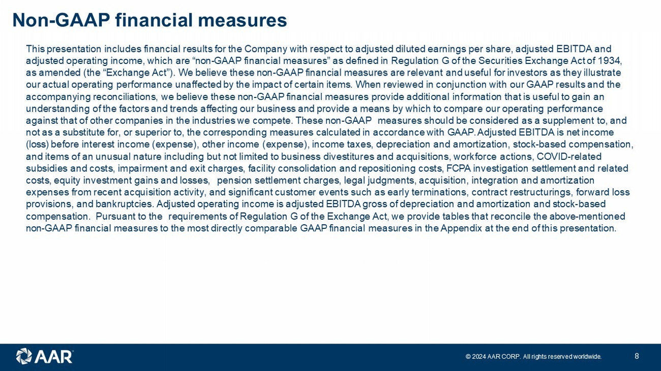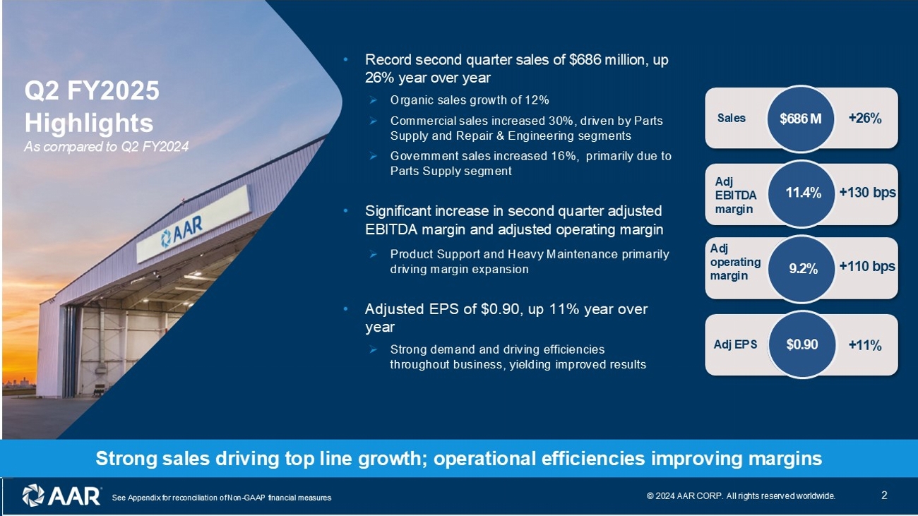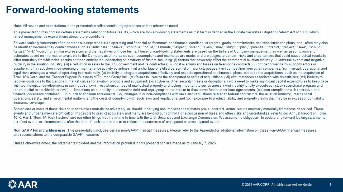 Forward - looking statements 1 © 2024 AAR CORP. All rights reserved worldwide. Note: All results and expectations in the presentation reflect continuing operations unless otherwise noted. This presentation may contain certain statements relating to future results, which are forward - looking statements as that term is defined in the Private Securities Litigation Reform Act of 1995, which reflect management’s expectations about future conditions . Forward - looking statements often address our expected future operating and financial performance and financial condition, or targets, goals, commitments, and other business plans, and often may also be identified because they contain words such as “anticipate,” “believe,” “continue,” “could,” “estimate,” “expect,” “intend,” “likely,” “may,” “might,” “plan,” “potential,” “predict,” “project,” “seek,” “should,” “target,” “will,” “would,” or similar expressions and the negatives of those terms. These forward - looking statements are based on the beliefs of Company management, as well as assumptions and estimates based on information available to the Company as of the dates such assumptions and estimates are made, and are subject to certain risks and uncertainties that could cause actual results to differ materially from historical results or those anticipated, depending on a variety of factors, including: ( i ) factors that adversely affect the commercial aviation industry; (ii) adverse events and negative publicity in the aviation industry; (iii) a reduction in sales to the U.S. government and its contractors; (iv) cost overruns and losses on fixed - price contracts; (v) nonperformance by subcontractors or suppliers; (vi) a reduction in outsourcing of maintenance activity by airlines; (vii) a shortage of skilled personnel or work stoppages; (viii) competition from other companies; (ix) financial, operational and legal risks arising as a result of operating internationally; (x) inability to integrate acquisitions effectively and execute operational and financial plans related to the acquisitions, such as the acquisition of Trax USA Corp. and the Product Support Business of Triumph Group Inc.; (xi) failure to realize the anticipated benefits of acquisitions; (xii) circumstances associated with divestitures; (xiii) inability to recover costs due to fluctuations in market values for aviation products and equipment; (xiv) cyber or other security threats or disruptions; (xv) a need to make significant capital expenditures to keep pace with technological developments in our industry; (xvi) restrictions on use of intellectual property and tooling important to our business; (xvii) inability to fully execute our stock repurchase program and return capital to stockholders; (xviii) limitations on our ability to access the debt and equity capital markets or to draw down funds under loan agreements; (xix) non - compliance with restrictive and financial covenants contained in our debt and loan agreements; (xx) changes in or non - compliance with laws and regulations related to federal contractors, the aviation industry, international operations, safety, and environmental matters, and the costs of complying with such laws and regulations; and (xxi) exposure to product liability and property claims that may be in excess of our liability insurance coverage. Should one or more of those risks or uncertainties materialize adversely, or should underlying assumptions or estimates prove incorrect, actual results may vary materially from those described. Those events and uncertainties are difficult or impossible to predict accurately and many are beyond our control. For a discussion of these and other risks and uncertainties, refer to our Annual Report on Form 10 - K, Part I, “Item 1A, Risk Factors” and our other filings filed from time to time with the U.S. Securities and Exchange Commission. We assume no obligation to update any forward - looking statements to reflect events or circumstances after the date of such statements or to reflect the occurrence of anticipated or unanticipated events. Non - GAAP Financial Measures: This presentation includes certain non - GAAP financial measures. Please refer to the Appendix for additional information on these non - GAAP financial measures and reconciliations to the comparable GAAP measures. Unless otherwise noted, the statements included and the information provided in this presentation are made as of January 7, 2025.