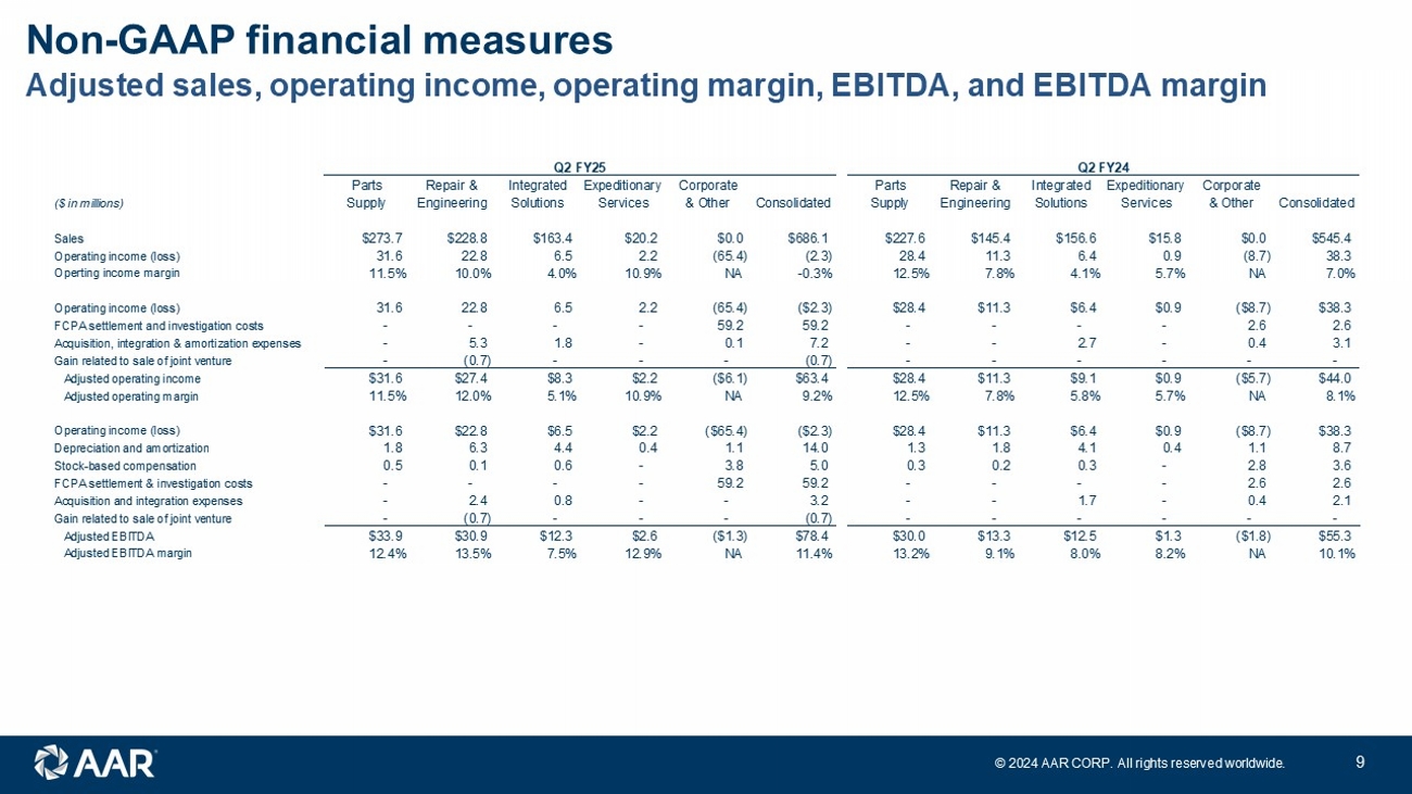 Non - GAAP financial measures 8 © 2024 AAR CORP. All rights reserved worldwide. This presentation includes financial results for the Company with respect to adjusted diluted earnings per share, adjusted EBITDA and adjusted operating income, which are “non - GAAP financial measures” as defined in Regulation G of the Securities Exchange Act of 1934, as amended (the “Exchange Act”). We believe these non - GAAP financial measures are relevant and useful for investors as they illustrate our actual operating performance unaffected by the impact of certain items. When reviewed in conjunction with our GAAP results and the accompanying reconciliations, we believe these non - GAAP financial measures provide additional information that is useful to gain an understanding of the factors and trends affecting our business and provide a means by which to compare our operating performance against that of other companies in the industries we compete. These non - GAAP measures should be considered as a supplement to, and not as a substitute for, or superior to, the corresponding measures calculated in accordance with GAAP. Adjusted EBITDA is net income (loss) before interest income (expense), other income (expense), income taxes, depreciation and amortization, stock - based compensation, and items of an unusual nature including but not limited to business divestitures and acquisitions, workforce actions, COVID - related subsidies and costs, impairment and exit charges, facility consolidation and repositioning costs, FCPA investigation settlement and related costs, equity investment gains and losses, pension settlement charges, legal judgments, acquisition, integration and amortization expenses from recent acquisition activity, and significant customer events such as early terminations, contract restructurings, forward loss provisions, and bankruptcies. Adjusted operating income is adjusted EBITDA gross of depreciation and amortization and stock - based compensation. Pursuant to the requirements of Regulation G of the Exchange Act, we provide tables that reconcile the above - mentioned non - GAAP financial measures to the most directly comparable GAAP financial measures in the Appendix at the end of this presentation.
