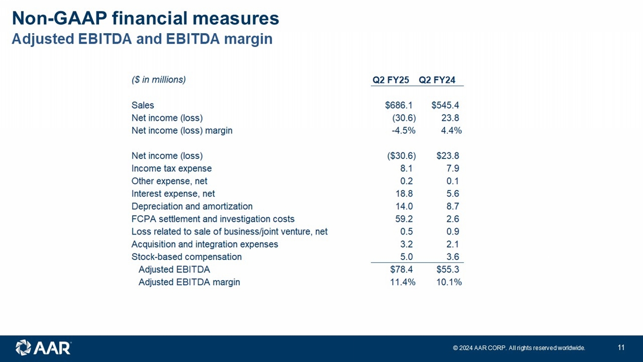 Non - GAAP financial measures A djusted sales, operating income, operating margin, EBITDA, and EBITDA margin 9 © 2024 AAR CORP. All rights reserved worldwide. Q2 FY25 Q2 FY24 Parts Repair & Integrated Expeditionary Corporate Parts Repair & Integrated Expeditionary Corporate ($ in millions) Supply Engineering Solutions Services & Other Consolidated Supply Engineering Solutions Services & Other Consolidated Sales $273.7 $228.8 $163.4 $20.2 $0.0 $686.1 $227.6 $145.4 $156.6 $15.8 $0.0 $545.4 Operating income (loss) 31.6 22.8 6.5 2.2 (65.4) (2.3) 28.4 11.3 6.4 0.9 (8.7) 38.3 Operting income margin 11.5% 10.0% 4.0% 10.9% NA -0.3% 12.5% 7.8% 4.1% 5.7% NA 7.0% Operating income (loss) 31.6 22.8 6.5 2.2 (65.4) ($2.3) $28.4 $11.3 $6.4 $0.9 ($8.7) $38.3 FCPA settlement and investigation costs - - - - 59.2 59.2 - - - - 2.6 2.6 Acquisition, integration & amortization expenses - 5.3 1.8 - 0.1 7.2 - - 2.7 - 0.4 3.1 Gain related to sale of joint venture - (0.7) - - - (0.7) - - - - - - Adjusted operating income $31.6 $27.4 $8.3 $2.2 ($6.1) $63.4 $28.4 $11.3 $9.1 $0.9 ($5.7) $44.0 Adjusted operating margin 11.5% 12.0% 5.1% 10.9% NA 9.2% 12.5% 7.8% 5.8% 5.7% NA 8.1% Operating income (loss) $31.6 $22.8 $6.5 $2.2 ($65.4) ($2.3) $28.4 $11.3 $6.4 $0.9 ($8.7) $38.3 Depreciation and amortization 1.8 6.3 4.4 0.4 1.1 14.0 1.3 1.8 4.1 0.4 1.1 8.7 Stock-based compensation 0.5 0.1 0.6 - 3.8 5.0 0.3 0.2 0.3 - 2.8 3.6 FCPA settlement & investigation costs - - - - 59.2 59.2 - - - - 2.6 2.6 Acquisition and integration expenses - 2.4 0.8 - - 3.2 - - 1.7 - 0.4 2.1 Gain related to sale of joint venture - (0.7) - - - (0.7) - - - - - - Adjusted EBITDA $33.9 $30.9 $12.3 $2.6 ($1.3) $78.4 $30.0 $13.3 $12.5 $1.3 ($1.8) $55.3 Adjusted EBITDA margin 12.4% 13.5% 7.5% 12.9% NA 11.4% 13.2% 9.1% 8.0% 8.2% NA 10.1%