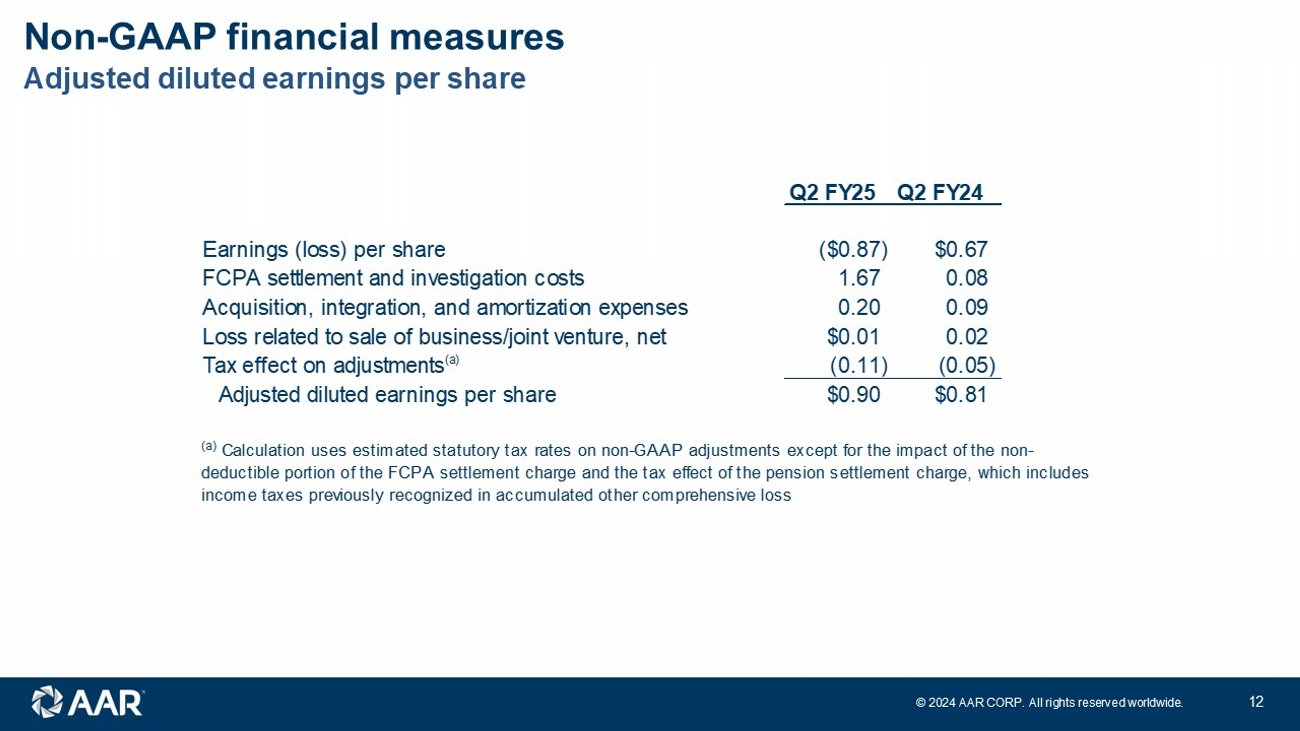 Non - GAAP financial measures Adjusted diluted earnings per share 1 2 © 2024 AAR CORP. All rights reserved worldwide. Q2 FY25 Q2 FY24 Earnings (loss) per share ($0.87) $0.67 FCPA settlement and investigation costs 1.67 0.08 Acquisition, integration, and amortization expenses 0.20 0.09 Loss related to sale of business/joint venture, net $0.01 0.02 Tax effect on adjustments (a) (0.11) (0.05) Adjusted diluted earnings per share $0.90 $0.81 (a) Calculation uses estimated statutory tax rates on non-GAAP adjustments except for the impact of the non- deductible portion of the FCPA settlement charge and the tax effect of the pension settlement charge, which includes income taxes previously recognized in accumulated other comprehensive loss