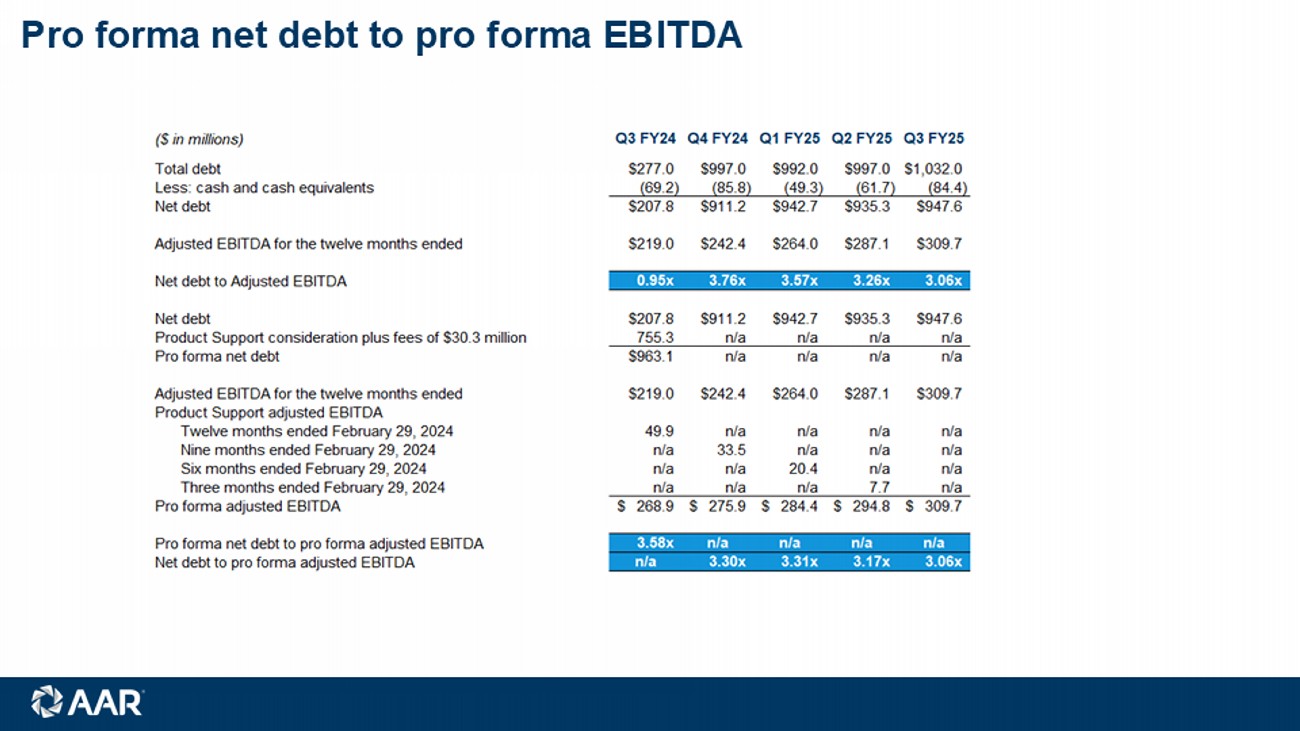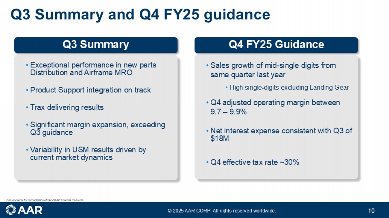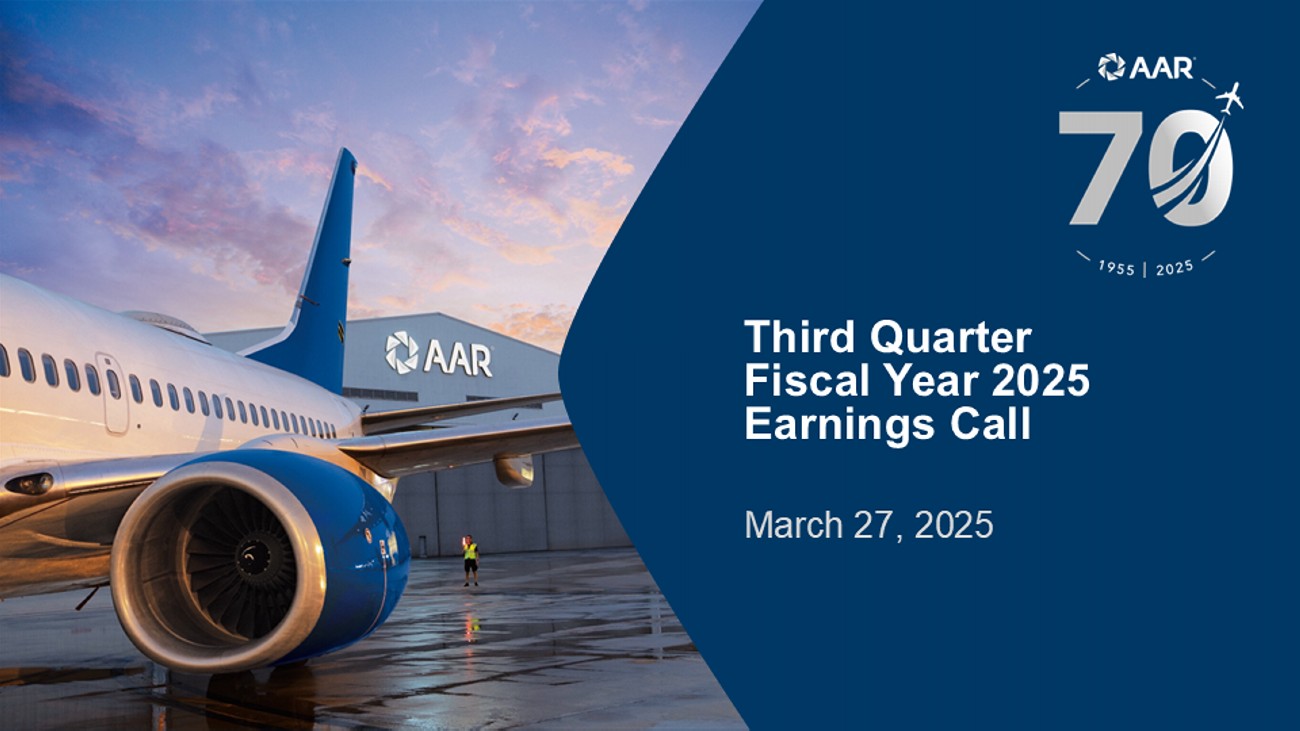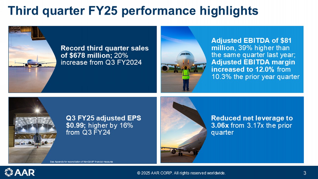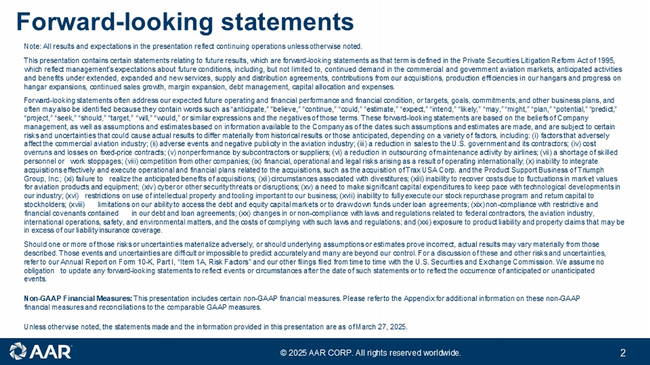 © 2025 AAR CORP. All rights reserved worldwide. 2 Forward - looking statements Note: All results and expectations in the presentation reflect continuing operations unless otherwise noted. This presentation contain s certain statements relating to future results, which are forward - looking statements as that term is defined in the Private Securities Litigation Reform Act of 1995, which reflect management’s expectations about future conditions , including, but not limited to, continued demand in the commercial and government aviation markets, anticipated activities and benefits under extended, expanded and new services, supply and distribution agreements, contributions from our acquisitio ns, production efficiencies in our hangars and progress on hangar expansions, continued sales growth, margin expansion, debt management, capital allocation and expenses . Forward - looking statements often address our expected future operating and financial performance and financial condition, or targets, goals, commitments, and other business plans, and often may also be identified because they contain words such as “anticipate,” “believe,” “continue,” “could,” “estimate,” “expect,” “intend,” “likely,” “may,” “might,” “plan,” “potential,” “predict,” “project,” “seek,” “should,” “target,” “will,” “would,” or similar expressions and the negatives of those terms. These forward - looking statements are based on the beliefs of Company management, as well as assumptions and estimates based on information available to the Company as of the dates such assumptions and estimates are made, and are subject to certain risks and uncertainties that could cause actual results to differ materially from historical results or those anticipated, depending on a variety of factors, including: (i) factors that adversely affect the commercial aviation industry; (ii) adverse events and negative publicity in the aviation industry; (iii) a reduction in sales to the U.S. government and its contractors; (iv) cost overruns and losses on fixed - price contracts; (v) nonperformance by subcontractors or suppliers; (vi) a reduction in outsourcing of maintenance activity by airlines; (vii) a shortage of skilled personnel or work stoppages; (viii) competition from other companies; (ix) financial, operational and legal risks arising as a result of operating internationally; (x) inability to integrate acquisitions effectively and execute operational and financial plans related to the acquisitions, such as the acquisition of Trax USA Corp. and the Product Support Business of Triumph Group , Inc.; (xi) failure to realize the anticipated benefits of acquisitions; (xii) circumstances associated with divestitures; (xiii) inability to recover costs due to fluctuations in market values for aviation products and equipment; (xiv) cyber or other security threats or disruptions; (xv) a need to make significant capital expenditures to keep pace with technological developments in our industry; (xvi) restrictions on use of intellectual property and tooling important to our business; (xvii) inability to fully execute our stock repurchase program and return capital to stockholders; (xviii) limitations on our ability to access the debt and equity capital markets or to draw down funds under loan agreements; (xix) non - compliance with restrictive and financial covenants contained in our debt and loan agreements; (xx) changes in or non - compliance with laws and regulations related to federal contractors, the aviation industry, international operations, safety, and environmental matters, and the costs of complying with such laws and regulations; and (xxi) exposure to product liability and property claims that may be in excess of our liability insurance coverage. Should one or more of those risks or uncertainties materialize adversely, or should underlying assumptions or estimates prove incorrect, actual results may vary materially from those described. Those events and uncertainties are difficult or impossible to predict accurately and many are beyond our control. For a discussion of these and other risks and uncertainties, refer to our Annual Report on Form 10 - K, Part I, “Item 1A, Risk Factors” and our other filings filed from time to time with the U.S. Securities and Exchange Commission. We assume no obligation to update any forward - looking statements to reflect events or circumstances after the date of such statements or to reflect the occurrence of anticipated or unanticipated events. Non - GAAP Financial Measures: This presentation includes certain non - GAAP financial measures. Please refer to the Appendix for additional information on these non - GAAP financial measures and reconciliations to the comparable GAAP measures. Unless otherwise noted, the statements made and the information provided in this presentation are as of March 27 , 202 5 .