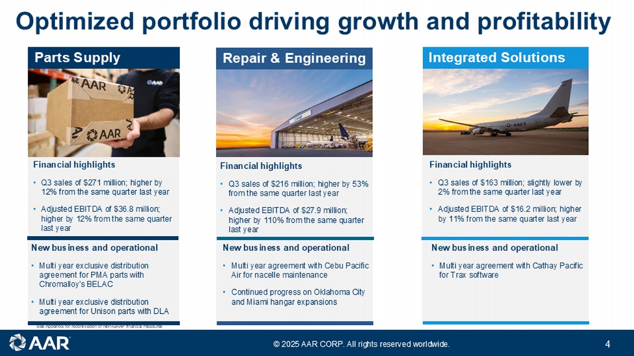 © 2025 AAR CORP. All rights reserved worldwide. 3 Third quarter FY25 performance highlights Record third quarter sales of $678 million; 20% increase from Q3 FY2024 Adjusted EBITDA of $81 million , 39% higher than the same quarter last year; Adjusted EBITDA margin increased to 12.0% from 10.3% the prior year quarter Q3 FY25 adjusted EPS $0.99; higher by 16% from Q3 FY24 Reduced net leverage to 3.06x from 3.17x the prior quarter See Appendix for reconciliation of Non - GAAP financial measures