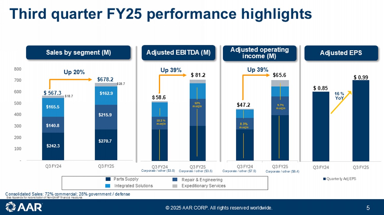© 2025 AAR CORP. All rights reserved worldwide. 4 Optimized portfolio driving growth and profitability Financial highlights • Q3 sales of $271 million; higher by 12% from the same quarter last year • Adjusted EBITDA of $36.8 million; higher by 12% from the same quarter last year Parts Supply Financial highlights • Q3 sales of $216 million; higher by 53% from the same quarter last year • Adjusted EBITDA of $27.9 million; higher by 110% from the same quarter last year Repair & Engineering • Add • add Financial highlights • Q3 sales of $163 million; slightly lower by 2% from the same quarter last year • Adjusted EBITDA of $16.2 million; higher by 11% from the same quarter last year Integrated Solutions New business and operational • Multi year exclusive distribution agreement for PMA parts with Chromalloy's BELAC • Multi year exclusive distribution agreement for Unison parts with DLA New business and operational • Multi year agreement with Cebu Pacific Air for nacelle maintenance • Continued progress on Oklahoma City and Miami hangar expansions New business and operational • Multi year agreement with Cathay Pacific for Trax software See Appendix for reconciliation of Non - GAAP financial measures