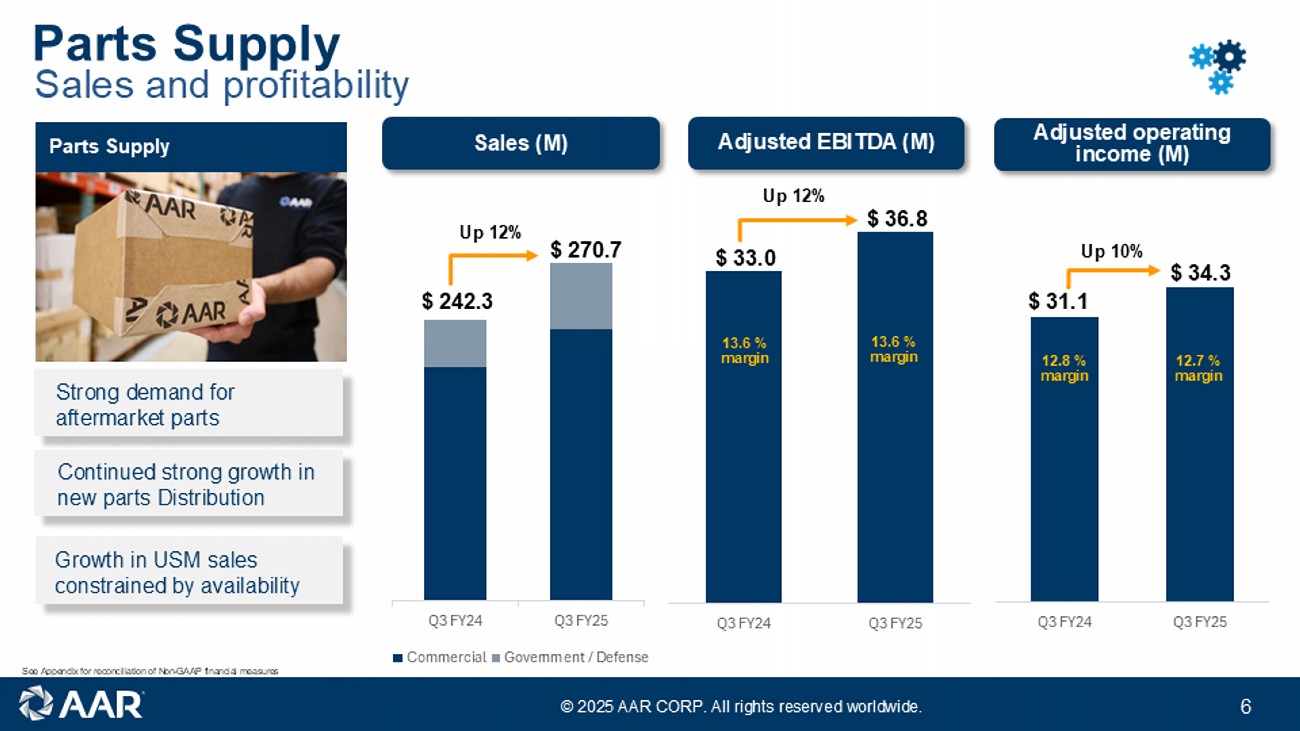 © 2025 AAR CORP. All rights reserved worldwide. 5 Q3 FY24 Q3 FY25 - 100 200 300 400 500 600 700 800 Q3 FY24 Q3 FY25 Up 20% $ 567.3 $678.2 Sales by segment (M) $242.3 $165.5 $270.7 $162.9 $215.9 $140.8 $18.7 $28.7 Adjusted operating income (M) Third quarter FY25 performance highlights $ 28 Q3 FY24 Q3 FY25 Quarterly Adj EPS $ 0.85 $ 0.99 16 % YoY Adjusted EBITDA (M) Adjusted EPS Q3 FY24 Q3 FY25 $ 81.2 $ 58.6 12% margin 10.3 % margin Corporate / other ($3.5) Corporate / other ($7.5) Corporate / other ($8.4) Corporate / other ($3.5) 8.3% margin 9.7% margin $47.2 $65.6 $270.7 $162.9 Consolidated Sales: 72% commercial; 28% government / defense Parts Supply Repair & Engineering Expeditionary Services Integrated Solutions Up 39% Up 39% See Appendix for reconciliation of Non - GAAP financial measures
