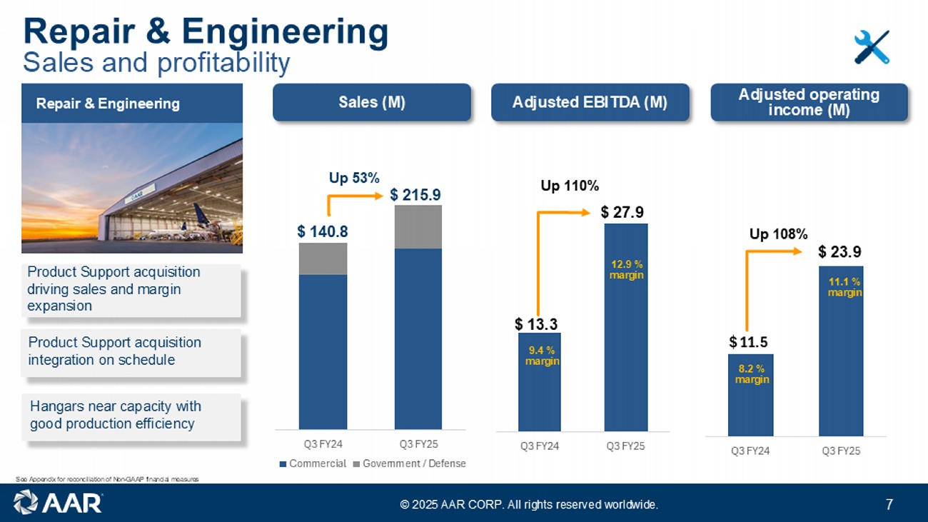 © 2025 AAR CORP. All rights reserved worldwide. 6 Sales and profitability Parts Supply Strong demand for aftermarket parts Continued strong growth in new parts Distribution Growth in USM sales constrained by availability Q3 FY24 Q3 FY25 $ 31.1 $ 34.3 12.8 % margin 12.7 % margin Up 10% Q3 FY24 Q3 FY25 $ 33.0 $ 36.8 13.6 % margin 13.6 % margin Up 12% Adjusted operating income (M) Adjusted EBITDA (M) Sales (M) Q3 FY24 Q3 FY25 Commercial Government / Defense $ 242.3 $ 270.7 Up 12% Parts Supply See Appendix for reconciliation of Non - GAAP financial measures