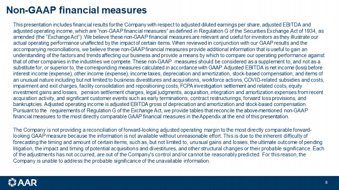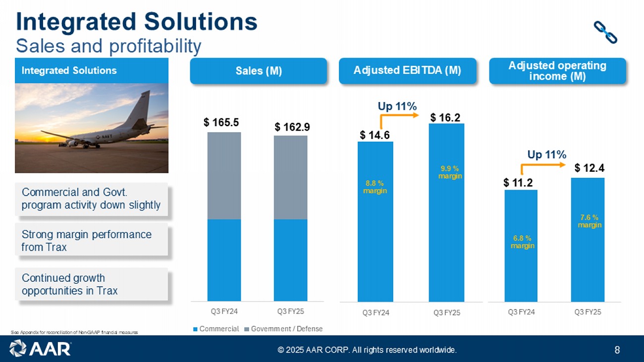 © 2025 AAR CORP. All rights reserved worldwide. 7 Q3 FY24 Q3 FY25 Commercial Government / Defense Sales and profitability Repair & Engineering Repair & Engineering Product Support acquisition driving sales and margin expansion Product Support acquisition integration on schedule Hangars near capacity with good production efficiency Adjusted operating income (M) Adjusted EBITDA (M) Sales (M) Q3 FY24 Q3 FY25 $ 11.5 $ 23.9 Up 108% 8.2 % margin 11.1 % margin Q3 FY24 Q3 FY25 $ 13.3 $ 27.9 Up 110% 9.4 % margin 12.9 % margin $ 140.8 $ 215.9 Up 53% See Appendix for reconciliation of Non - GAAP financial measures