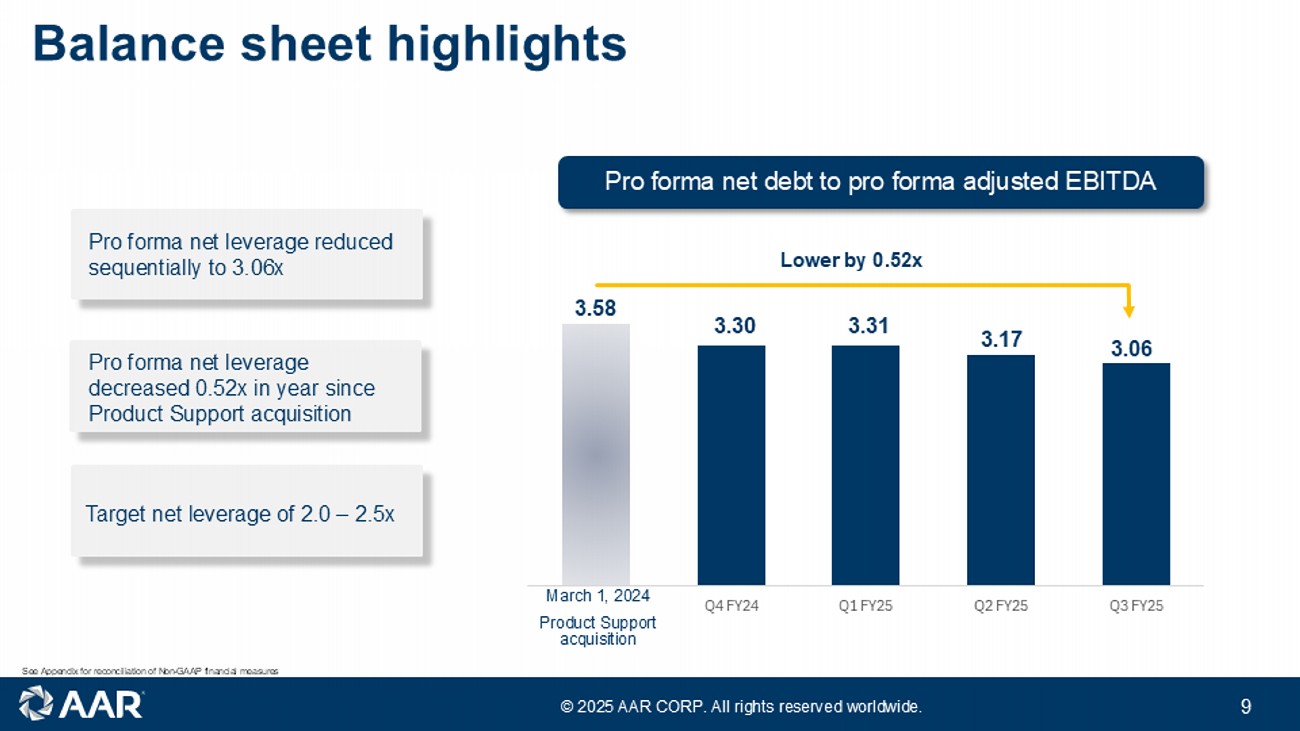 © 2025 AAR CORP. All rights reserved worldwide. 8 Sales and profitability Integrated Solutions Integrated Solutions Commercial and Govt. program activity down slightly Strong margin performance from Trax Continued growth opportunities in Trax Adjusted operating income (M) Adjusted EBITDA (M) Sales (M) Q3 FY24 Q3 FY25 $ 11.2 $ 12.4 6.8 % margin 7.6 % margin Q3 FY24 Q3 FY25 $ 14.6 $ 16.2 8.8 % margin 9.9 % margin Q3 FY24 Q3 FY25 Commercial Government / Defense $ 165.5 $ 162.9 Up 11% Up 11% See Appendix for reconciliation of Non - GAAP financial measures