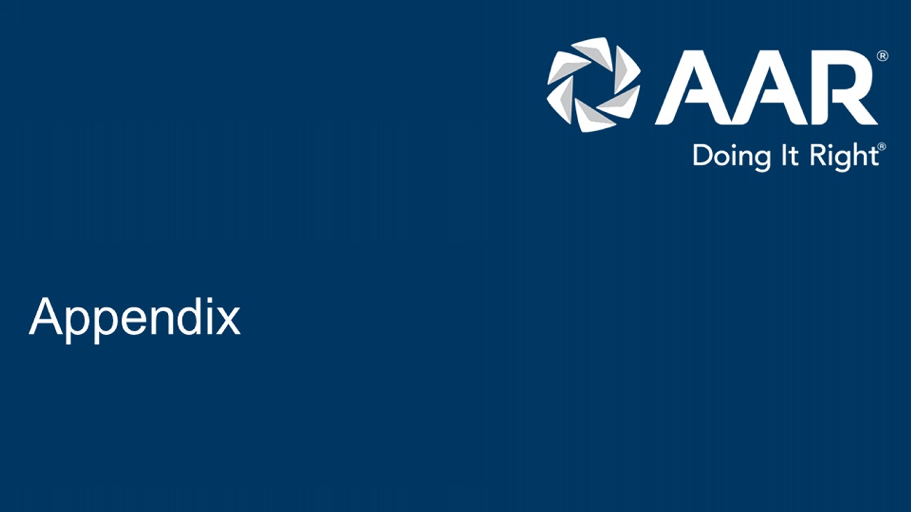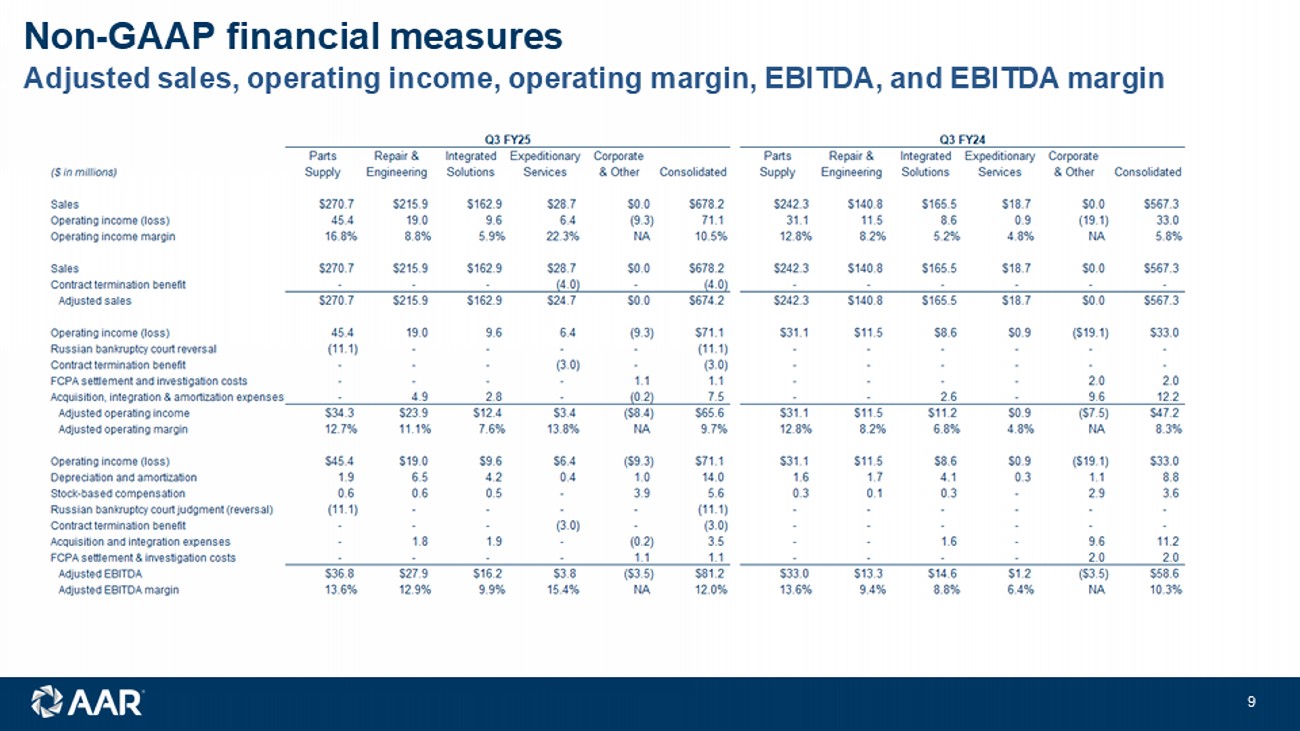 Non - GAAP financial measures 8 © 2024 AAR CORP. All rights reserved worldwide. This presentation includes financial results for the Company with respect to adjusted diluted earnings per share, adjusted EBITDA and adjusted operating income, which are “non - GAAP financial measures” as defined in Regulation G of the Securities Exchange Act of 1934, as amended (the “Exchange Act”). We believe these non - GAAP financial measures are relevant and useful for investors as they illustrate our actual operating performance unaffected by the impact of certain items. When reviewed in conjunction with our GAAP results and the accompanying reconciliations, we believe these non - GAAP financial measures provide additional information that is useful to gain an understanding of the factors and trends affecting our business and provide a means by which to compare our operating performance against that of other companies in the industries we compete. These non - GAAP measures should be considered as a supplement to, and not as a substitute for, or superior to, the corresponding measures calculated in accordance with GAAP. Adjusted EBITDA is net income (loss) before interest income (expense), other income (expense), income taxes, depreciation and amortization, stock - based compensation, and items of an unusual nature including but not limited to business divestitures and acquisitions, workforce actions, COVID - related subsidies and costs, impairment and exit charges, facility consolidation and repositioning costs, FCPA investigation settlement and related costs, equity investment gains and losses, pension settlement charges, legal judgments, acquisition, integration and amortization expenses from recent acquisition activity, and significant customer events such as early terminations, contract restructurings, forward loss provisions, and bankruptcies. Adjusted operating income is adjusted EBITDA gross of depreciation and amortization and stock - based compensation. Pursuant to the requirements of Regulation G of the Exchange Act, we provide tables that reconcile the above - mentioned non - GAAP financial measures to the most directly comparable GAAP financial measures in the Appendix at the end of this presentation. The Company is not providing a reconciliation of forward - looking adjusted operating margin to the most directly comparable forward - looking GAAP measure because the information is not available without unreasonable effort. This is due to the inherent difficulty of forecasting the timing and amount of certain items, such as, but not limited to, unusual gains and losses, the ultimate outcome of pending litigation, the impact and timing of potential acquisitions and divestitures, and other structural changes or their probable significance. Each of the adjustments has not occurred, are out of the Company's control and/or cannot be reasonably predicted. For this reason, the Company is unable to address the probable significance of the unavailable information.