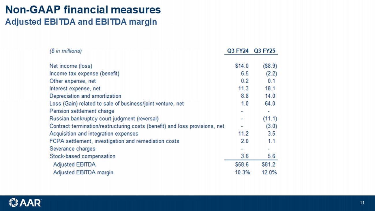 © 2025 AAR CORP. All rights reserved worldwide. 10 Q3 Summary and Q4 FY25 guidance Q4 FY25 Guidance • Sales growth of mid - single digits from same quarter last year • High single - digits excluding Landing Gear • Q4 adjusted operating margin between 9.7 – 9.9% • Net interest expense consistent with Q3 of $18M • Q4 effective tax rate ~30% Q3 Summary • Exceptional performance in new parts Distribution and Airframe MRO • Product Support integration on track • Trax delivering results • Significant margin expansion, exceeding Q3 guidance • Variability in USM results driven by current market dynamics See Appendix for reconciliation of Non - GAAP financial measures