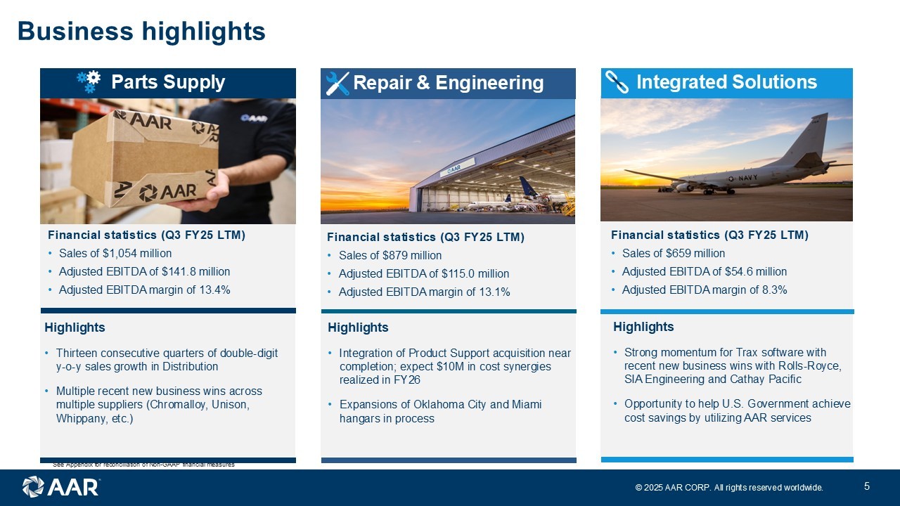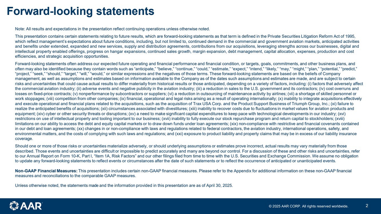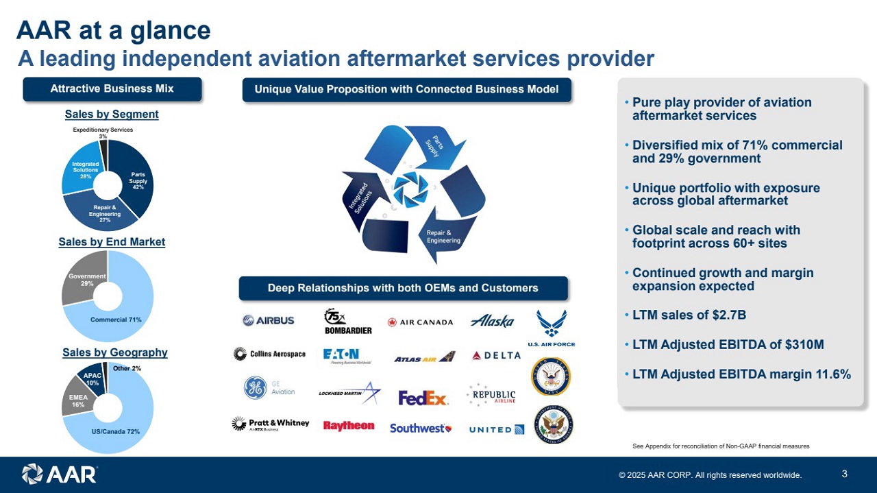 ©2025 AAR CORP. All rights reserved worldwide. 2 Forward-looking statements ©1 2 0 2 4 A A R C O R P . A l l r i g h t s r e s e r v e d w o r l d w i d e . Note: All results and expectations in the presentation reflect continuing operations unless otherwise noted. This presentation contains certain statements relating to future results, which are forward-looking statements as that term is defined in the Private Securities Litigation Reform Act of 1995, which reflect management’s expectations about future conditions, including, but not limited to, continued demand in the commercial and government aviation markets, anticipated activities and benefits under extended, expanded and new services, supply and distribution agreements, contributions from our acquisitions, leveraging strengths across our businesses, digital and intellectual property enabled offerings, progress on hangar expansions, continued sales growth, margin expansion, debt management, capital allocation, expenses, production and cost efficiencies, and strategic acquisition opportunities. Forward-looking statements often address our expected future operating and financial performance and financial condition, or targets, goals, commitments, and other business plans, and often may also be identified because they contain words such as “anticipate,” “believe,” “continue,” “could,” “estimate,” “expect,” “intend,” “likely,” “may,” “might,” “plan,” “potential,” “predict,” “project,” “seek,” “should,” “target,” “will,” “would,” or similar expressions and the negatives of those terms. These forward-looking statements are based on the beliefs of Company management, as well as assumptions and estimates based on information available to the Company as of the dates such assumptions and estimates are made, and are subject to certain risks and uncertainties that could cause actual results to differ materially from historical results or those anticipated, depending on a variety of factors, including: (i) factors that adversely affect the commercial aviation industry; (ii) adverse events and negative publicity in the aviation industry; (iii) a reduction in sales to the U.S. government and its contractors; (iv) cost overruns and losses on fixed-price contracts; (v) nonperformance by subcontractors or suppliers; (vi) a reduction in outsourcing of maintenance activity by airlines; (vii) a shortage of skilled personnel or work stoppages; (viii) competition from other companies; (ix) financial, operational and legal risks arising as a result of operating internationally; (x) inability to integrate acquisitions effectively and execute operational and financial plans related to the acquisitions, such as the acquisition of Trax USA Corp. and the Product Support Business of Triumph Group, Inc.; (xi) failure to realize the anticipated benefits of acquisitions; (xii) circumstances associated with divestitures; (xiii) inability to recover costs due to fluctuations in market values for aviation products and equipment; (xiv) cyber or other security threats or disruptions; (xv) a need to make significant capital expenditures to keep pace with technological developments in our industry; (xvi) restrictions on use of intellectual property and tooling important to our business; (xvii) inability to fully execute our stock repurchase program and return capital to stockholders; (xviii) limitations on our ability to access the debt and equity capital markets or to draw down funds under loan agreements; (xix) non-compliance with restrictive and financial covenants contained in our debt and loan agreements; (xx) changes in or non-compliance with laws and regulations related to federal contractors, the aviation industry, international operations, safety, and environmental matters, and the costs of complying with such laws and regulations; and (xxi) exposure to product liability and property claims that may be in excess of our liability insurance coverage. Should one or more of those risks or uncertainties materialize adversely, or should underlying assumptions or estimates prove incorrect, actual results may vary materially from those described. Those events and uncertainties are difficult or impossible to predict accurately and many are beyond our control. For a discussion of these and other risks and uncertainties, refer to our Annual Report on Form 10-K, Part I, “Item 1A, Risk Factors” and our other filings filed from time to time with the U.S. Securities and Exchange Commission. We assume no obligation to update any forward-looking statements to reflect events or circumstances after the date of such statements or to reflect the occurrence of anticipated or unanticipated events. Non-GAAP Financial Measures: This presentation includes certain non-GAAP financial measures. Please refer to the Appendix for additional information on these non-GAAP financial measures and reconciliations to the comparable GAAP measures. Unless otherwise noted, the statements made and the information provided in this presentation are as of April 30, 2025.