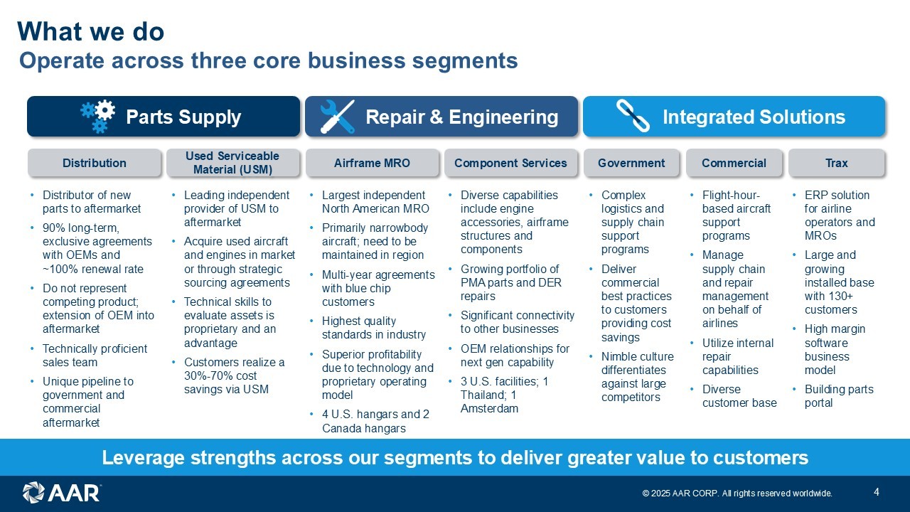 © 2025 AAR CORP. All rights reserved worldwide. 3 US/Canada 72% EMEA 16% APAC 10% Other 2% AAR at a glance A leading independent aviation aftermarket services provider Parts Supply 42% Repair & Engineering 27% Integrated Solutions 28% Expeditionary Services 3% Commercial 71% Government 29% • Pure play provider of aviation aftermarket services • Diversified mix of 71% commercial and 29% government • Unique portfolio with exposure across global aftermarket • Global scale and reach with footprint across 60+ sites • Continued growth and margin expansion expected • LTM sales of $2.7B • LTM Adjusted EBITDA of $310M • LTM Adjusted EBITDA margin 11.6% Attractive Business Mix Unique Value Proposition with Connected Business Model Sales by Segment Sales by End Market Sales by Geography Deep Relationships with both OEMs and Customers See Appendix for reconciliation of Non-GAAP financial measures