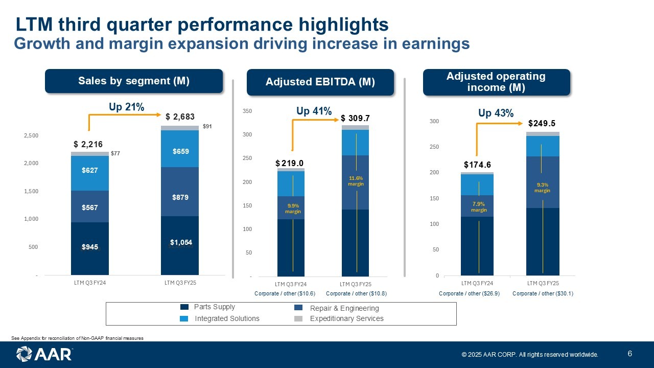 © 2025 AAR CORP. All rights reserved worldwide. 5 Business highlights Financial statistics (Q3 FY25 LTM) • Sales of $1,054 million • Adjusted EBITDA of $141.8 million • Adjusted EBITDA margin of 13.4% Parts Supply Financial statistics (Q3 FY25 LTM) • Sales of $879 million • Adjusted EBITDA of $115.0 million • Adjusted EBITDA margin of 13.1% Repair & Engineering • Add • add Financial statistics (Q3 FY25 LTM) • Sales of $659 million • Adjusted EBITDA of $54.6 million • Adjusted EBITDA margin of 8.3% Integrated Solutions Highlights • Thirteen consecutive quarters of double - digit y - o - y sales growth in Distribution • Multiple recent new business wins across multiple suppliers (Chromalloy, Unison, Whippany, etc.) Highlights • Integration of Product Support acquisition near completion; expect $10M in cost synergies realized in FY26 • Expansions of Oklahoma City and Miami hangars in process Highlights • Strong momentum for Trax software with recent new business wins with Rolls - Royce, SIA Engineering and Cathay Pacific • Opportunity to help U.S. Government achieve cost savings by utilizing AAR services See Appendix for reconciliation of Non - GAAP financial measures