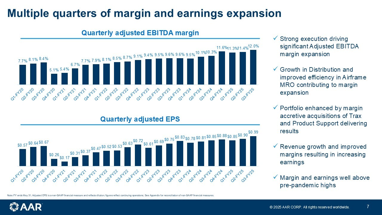 © 2025 AAR CORP. All rights reserved worldwide. 6 - 50 100 150 200 250 300 350 LTM Q3 FY24 LTM Q3 FY25 $ 309.7 $ 219.0 11.6% margin 9.9% margin 0 50 100 150 200 250 300 LTM Q3 FY24 LTM Q3 FY25 $945.30 $1,054.40 - 500 1,000 1,500 2,000 2,500 LTM Q3 FY24 LTM Q3 FY25 Up 21% $ 2,216 $ 2,683 Sales by segment (M) $945 $627 $1,054 $659 $879 $567 $77 $91 Adjusted operating income (M) LTM third quarter performance highlights Adjusted EBITDA (M) Corporate / other ($10.6) Corporate / other ($26.9) Corporate / other ($30.1) Corporate / other ($10.8) 7.9% margin 9.3% margin $174.6 $249.5 $270.7 $162.9 Parts Supply Repair & Engineering Expeditionary Services Integrated Solutions Up 41% Up 43% See Appendix for reconciliation of Non - GAAP financial measures Growth and margin expansion driving increase in earnings
