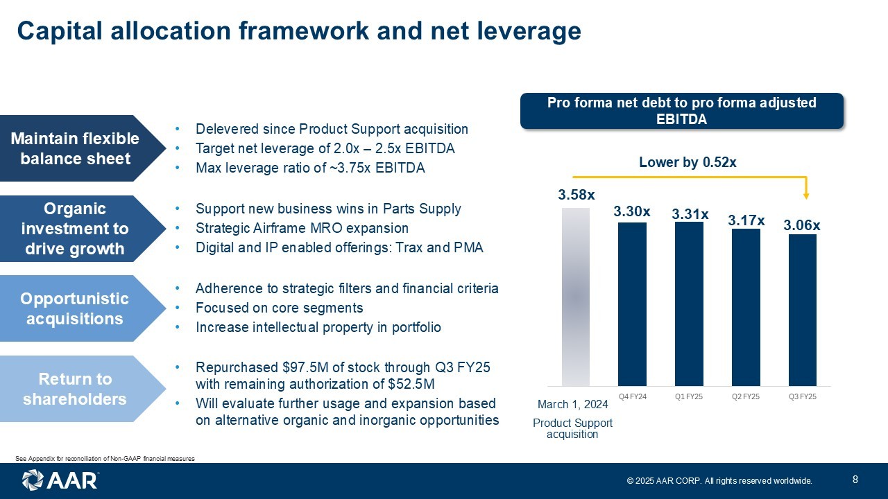 © 2025 AAR CORP. All rights reserved worldwide. 7 x Strong execution driving significant Adjusted EBITDA margin expansion x Growth in Distribution and improved efficiency in Airframe MRO contributing to margin expansion x Portfolio enhanced by margin accretive acquisitions of Trax and Product Support delivering results x Revenue growth and improved margins resulting in increasing earnings x Margin and earnings well above pre - pandemic highs Multiple quarters of margin and earnings expansion Note: FY ends May 31; Adjusted EPS is a non - GAAP financial measure and reflects dilution; figures reflect continuing operations; See Appendix for reconciliation of non - GAAP financial measures. $0.57 $0.64 $0.67 $0.26 $0.17 $0.31 $0.37 $0.47 $0.52 $0.53 $0.63 $0.72 $0.61 $0.69 $0.75 $0.83 $0.78 $0.81 $0.85 $0.88 $0.85 $0.90 $0.99 Quarterly adjusted EPS 7.7% 8.1% 8.4% 5.1% 5.4% 6.7% 7.7% 7.9% 8.1% 8.5% 8.7% 9.1% 9.4% 9.5% 9.6% 9.6% 9.5% 10.1% 10.3% 11.6% 11.3% 11.4% 12.0% Quarterly adjusted EBITDA margin