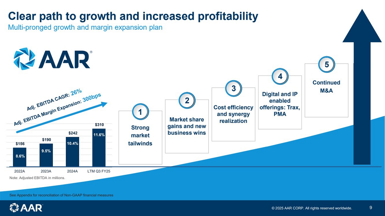 © 2025 AAR CORP. All rights reserved worldwide. 8 Capital allocation framework and net leverage Q4 FY24 Q1 FY25 Q2 FY25 Q3 FY25 3.17x 3.31x 3.30x 3.58x March 1, 2024 Product Support acquisition Lower by 0.52x Pro forma net debt to pro forma adjusted EBITDA 3.06x See Appendix for reconciliation of Non - GAAP financial measures Maintain flexible balance sheet Organic investment to drive growth Opportunistic acquisitions Return to shareholders • Delevered since Product Support acquisition • Target net leverage of 2.0x – 2.5x EBITDA • Max leverage ratio of ~3.75x EBITDA • Support new business wins in Parts Supply • Strategic Airframe MRO expansion • Digital and IP enabled offerings: Trax and PMA • Adherence to strategic filters and financial criteria • Focused on core segments • Increase intellectual property in portfolio • Repurchased $97.5M of stock through Q3 FY25 with remaining authorization of $52.5M • Will evaluate further usage and expansion based on alternative organic and inorganic opportunities