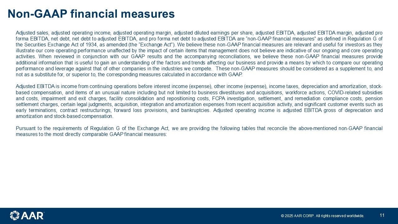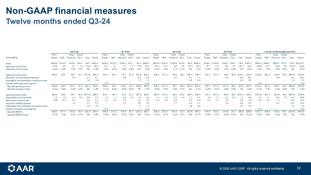 © 2025 AAR CORP. All rights reserved worldwide. 11 Non - GAAP financial measures Adjusted sales, adjusted operating income, adjusted operating margin, adjusted diluted earnings per share, adjusted EBITDA, adjusted EBITDA margin, adjusted pro forma EBITDA, net debt, net debt to adjusted EBITDA, and pro forma net debt to adjusted EBITDA are “non - GAAP financial measures” as defined in Regulation G of the Securities Exchange Act of 1934 , as amended (the “Exchange Act”) . We believe these non - GAAP financial measures are relevant and useful for investors as they illustrate our core operating performance unaffected by the impact of certain items that management does not believe are indicative of our ongoing and core operating activities . When reviewed in conjunction with our GAAP results and the accompanying reconciliations, we believe these non - GAAP financial measures provide additional information that is useful to gain an understanding of the factors and trends affecting our business and provide a means by which to compare our operating performance and leverage against that of other companies in the industries we compete . These non - GAAP measures should be considered as a supplement to, and not as a substitute for, or superior to, the corresponding measures calculated in accordance with GAAP . Adjusted EBITDA is income from continuing operations before interest income (expense), other income (expense), income taxes, depreciation and amortization, stock - based compensation, and items of an unusual nature including but not limited to business divestitures and acquisitions, workforce actions, COVID - related subsidies and costs, impairment and exit charges, facility consolidation and repositioning costs, FCPA investigation, settlement, and remediation compliance costs, pension settlement charges, certain legal judgments, acquisition, integration and amortization expenses from recent acquisition activity, and significant customer events such as early terminations, contract restructurings, forward loss provisions, and bankruptcies . Adjusted operating income is adjusted EBITDA gross of depreciation and amortization and stock - based compensation . Pursuant to the requirements of Regulation G of the Exchange Act, we are providing the following tables that reconcile the above - mentioned non - GAAP financial measures to the most directly comparable GAAP financial measures :