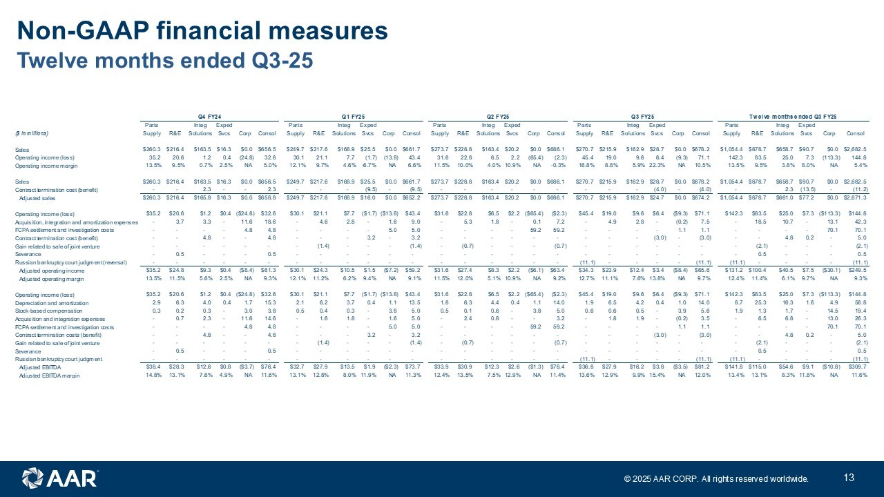 © 2025 AAR CORP. All rights reserved worldwide. 12 Twelve months ended Q3 - 24 Non - GAAP financial measures Q4 FY23 Q1 FY24 Q2 FY24 Q3 FY24 Twelve months ended Q3 FY24 Parts Integ Exped Parts Integ Exped Parts Integ Exped Parts Integ Exped Parts Integ Exped ($ in millions) Supply R&E Solutions Svcs Corp Consol Supply R&E Solutions Svcs Corp Consol Supply R&E Solutions Svcs Corp Consol Supply R&E Solutions Svcs Corp Consol Supply R&E Solutions Svcs Corp Consol Sales $238.6 $143.0 $148.3 $23.4 $0.0 $553.3 $236.8 $137.5 $156.3 $19.1 $0.0 $549.7 $227.6 $145.4 $156.6 $15.8 $0.0 $545.4 $242.3 $140.8 $165.5 $18.7 $0.0 $567.3 $945.3 $566.7 $626.7 $77.0 $0.0 $2,215.7 Operating income (loss) 29.0 9.5 8.1 1.5 (11.8) 36.3 15.1 9.1 7.7 1.3 (7.9) 25.3 28.4 11.3 6.4 0.9 (8.7) 38.3 31.1 11.5 8.6 0.9 (19.1) 33.0 103.6 41.4 30.8 4.6 (47.5) 132.9 Operating income margin 12.2% 6.6% 5.5% 6.4% NA 6.6% 6.4% 6.6% 4.9% 6.8% NA 4.6% 12.5% 7.8% 4.1% 5.7% NA 7.0% 12.8% 8.2% 5.2% 4.8% NA 5.8% 11.0% 7.3% 4.9% 6.0% NA 6.0% Operating income (loss) $29.0 $9.5 $8.1 $1.5 ($11.8) $36.3 $15.1 $9.1 $7.7 $1.3 ($7.9) $25.3 $28.4 $11.3 $6.4 $0.9 ($8.7) $38.3 $31.1 $11.5 $8.6 $0.9 ($19.1) $33.0 $103.6 $41.4 $30.8 $4.6 ($47.5) $132.9 Acquisition and amortization expenses - - 2.0 - 3.1 5.1 - - 2.6 - 0.2 2.8 - 2.7 - 0.4 3.1 - - 2.6 - 9.6 12.2 - - 9.9 - 13.3 23.2 Investigation and remediation compliance costs - - - - 1.6 1.6 - - - - 1.1 1.1 - - - - 2.6 2.6 - - - - 2.0 2.0 - - - - 7.3 7.3 Russian bankruptcy court judgment - - - - - - 11.2 - - - - 11.2 - - - - - - - - - - - - 11.2 - - - - 11.2 Adjusted operating income $29.0 $9.5 $10.1 $1.5 ($7.1) $43.0 $26.3 $9.1 $10.3 $1.3 ($6.6) $40.4 $28.4 $11.3 $9.1 $0.9 ($5.7) $44.0 $31.1 $11.5 $11.2 $0.9 ($7.5) $47.2 $114.8 $41.4 $40.7 $4.6 ($26.9) $174.6 Adjusted operating margin 12.2% 6.6% 6.8% 6.4% NA 7.8% 11.1% 6.6% 6.6% 6.8% NA 7.3% 12.5% 7.8% 5.8% 5.7% NA 8.1% 12.8% 8.2% 6.8% 4.8% NA 8.3% 12.1% 7.3% 6.5% 6.0% NA 7.9% Operating income (loss) $29.0 $9.5 $8.1 $1.5 ($11.8) $36.3 $15.1 $9.1 $7.7 $1.3 ($7.9) $25.3 $28.4 $11.3 $6.4 $0.9 ($8.7) $38.3 $31.1 $11.5 $8.6 $0.9 ($19.1) $33.0 $103.6 $41.4 $30.8 $4.6 ($47.5) $132.9 Depreciation and amortization 1.5 1.9 3.1 0.4 0.8 7.7 1.3 1.7 4.0 0.4 1.0 8.4 1.3 1.8 4.1 0.4 1.1 8.7 1.6 1.7 4.1 0.3 1.1 8.8 5.7 7.1 15.3 1.5 4.0 33.6 Stock-based compensation (0.2) (0.1) 0.2 - 3.2 3.1 0.4 0.2 0.3 - 3.4 4.3 0.3 0.2 0.3 - 2.8 3.6 0.3 0.1 0.3 - 2.9 3.6 0.8 0.4 1.1 - 12.3 14.6 Acquisition-related expenses - - 1.2 - 3.1 4.3 - - 1.6 - 0.2 1.8 - - 1.7 - 0.4 2.1 - - 1.6 - 9.6 11.2 - - 6.1 - 13.3 19.4 Investigation and remediation compliance costs - - - - 1.6 1.6 - - - - 1.1 1.1 - - - - 2.6 2.6 - - - - 2.0 2.0 - - - - 7.3 7.3 Russian bankruptcy court judgment - - - - - - 11.2 - - - - 11.2 - - - - - - - - - - - - 11.2 - - - - 11.2 Adjusted EBITDA $30.3 $11.3 $12.6 $1.9 ($3.1) $53.0 $28.0 $11.0 $13.6 $1.7 ($2.2) $52.1 $30.0 $13.3 $12.5 $1.3 ($1.8) $55.3 $33.0 $13.3 $14.6 $1.2 ($3.5) $58.6 $121.3 $48.9 $53.3 $6.1 ($10.6) $219.0 Adjusted EBITDA margin 12.7% 7.9% 8.5% 8.1% NA 9.6% 11.8% 8.0% 8.7% 8.9% NA 9.5% 13.2% 9.1% 8.0% 8.2% NA 10.1% 13.6% 9.4% 8.8% 6.4% NA 10.3% 12.8% 8.6% 8.5% 7.9% NA 9.9%