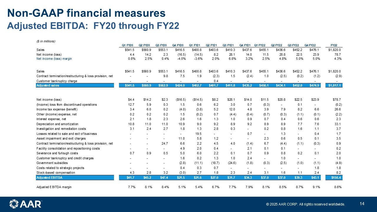 © 2025 AAR CORP. All rights reserved worldwide. 13 Twelve months ended Q3 - 25 Non - GAAP financial measures Q4 FY24 Q1 FY25 Q2 FY25 Q3 FY25 Twelve months ended Q3 FY25 Parts Integ Exped Parts Integ Exped Parts Integ Exped Parts Integ Exped Parts Integ Exped ($ in millions) Supply R&E Solutions Svcs Corp Consol Supply R&E Solutions Svcs Corp Consol Supply R&E Solutions Svcs Corp Consol Supply R&E Solutions Svcs Corp Consol Supply R&E Solutions Svcs Corp Consol Sales $260.3 $216.4 $163.5 $16.3 $0.0 $656.5 $249.7 $217.6 $168.9 $25.5 $0.0 $661.7 $273.7 $228.8 $163.4 $20.2 $0.0 $686.1 $270.7 $215.9 $162.9 $28.7 $0.0 $678.2 $1,054.4 $878.7 $658.7 $90.7 $0.0 $2,682.5 Operating income (loss) 35.2 20.6 1.2 0.4 (24.8) 32.6 30.1 21.1 7.7 (1.7) (13.8) 43.4 31.6 22.8 6.5 2.2 (65.4) (2.3) 45.4 19.0 9.6 6.4 (9.3) 71.1 142.3 83.5 25.0 7.3 (113.3) 144.8 Operating income margin 13.5% 9.5% 0.7% 2.5% NA 5.0% 12.1% 9.7% 4.6% -6.7% NA 6.6% 11.5% 10.0% 4.0% 10.9% NA -0.3% 16.8% 8.8% 5.9% 22.3% NA 10.5% 13.5% 9.5% 3.8% 8.0% NA 5.4% Sales $260.3 $216.4 $163.5 $16.3 $0.0 $656.5 $249.7 $217.6 $168.9 $25.5 $0.0 $661.7 $273.7 $228.8 $163.4 $20.2 $0.0 $686.1 $270.7 $215.9 $162.9 $28.7 $0.0 $678.2 $1,054.4 $878.7 $658.7 $90.7 $0.0 $2,682.5 Contract termination cost (benefit) - - 2.3 - - 2.3 - - - (9.5) - (9.5) - - - - - - - - - (4.0) - (4.0) - - 2.3 (13.5) - (11.2) Adjusted sales $260.3 $216.4 $165.8 $16.3 $0.0 $658.8 $249.7 $217.6 $168.9 $16.0 $0.0 $652.2 $273.7 $228.8 $163.4 $20.2 $0.0 $686.1 $270.7 $215.9 $162.9 $24.7 $0.0 $674.2 $1,054.4 $878.7 $661.0 $77.2 $0.0 $2,671.3 Operating income (loss) $35.2 $20.6 $1.2 $0.4 ($24.8) $32.6 $30.1 $21.1 $7.7 ($1.7) ($13.8) $43.4 $31.6 $22.8 $6.5 $2.2 ($65.4) ($2.3) $45.4 $19.0 $9.6 $6.4 ($9.3) $71.1 $142.3 $83.5 $25.0 $7.3 ($113.3) $144.8 Acquisition, integration and amortization expenses - 3.7 3.3 - 11.6 18.6 - 4.6 2.8 - 1.6 9.0 - 5.3 1.8 - 0.1 7.2 - 4.9 2.8 - (0.2) 7.5 - 18.5 10.7 - 13.1 42.3 FCPA settlement and investigation costs - - - - 4.8 4.8 - - - - 5.0 5.0 - - - - 59.2 59.2 - - - - 1.1 1.1 - - - - 70.1 70.1 Contract termination cost (benefit) - - 4.8 - - 4.8 - - - 3.2 - 3.2 - - - - - - - - - (3.0) - (3.0) - - 4.8 0.2 - 5.0 Gain related to sale of joint venture - - - - - - - (1.4) - - - (1.4) - (0.7) - - - (0.7) - - - - - - - (2.1) - - - (2.1) Severance - 0.5 - - - 0.5 - - - - - - - - - - - - - - - - - - - 0.5 - - - 0.5 Russian bankruptcy court judgment (reversal) - - - - - - - - - - - - - - - - - - (11.1) - - - - (11.1) (11.1) - - - - (11.1) Adjusted operating income $35.2 $24.8 $9.3 $0.4 ($8.4) $61.3 $30.1 $24.3 $10.5 $1.5 ($7.2) $59.2 $31.6 $27.4 $8.3 $2.2 ($6.1) $63.4 $34.3 $23.9 $12.4 $3.4 ($8.4) $65.6 $131.2 $100.4 $40.5 $7.5 ($30.1) $249.5 Adjusted operating margin 13.5% 11.5% 5.6% 2.5% NA 9.3% 12.1% 11.2% 6.2% 9.4% NA 9.1% 11.5% 12.0% 5.1% 10.9% NA 9.2% 12.7% 11.1% 7.6% 13.8% NA 9.7% 12.4% 11.4% 6.1% 9.7% NA 9.3% Operating income (loss) $35.2 $20.6 $1.2 $0.4 ($24.8) $32.6 $30.1 $21.1 $7.7 ($1.7) ($13.8) $43.4 $31.6 $22.8 $6.5 $2.2 ($65.4) ($2.3) $45.4 $19.0 $9.6 $6.4 ($9.3) $71.1 $142.3 $83.5 $25.0 $7.3 ($113.3) $144.8 Depreciation and amortization 2.9 6.3 4.0 0.4 1.7 15.3 2.1 6.2 3.7 0.4 1.1 13.5 1.8 6.3 4.4 0.4 1.1 14.0 1.9 6.5 4.2 0.4 1.0 14.0 8.7 25.3 16.3 1.6 4.9 56.8 Stock-based compensation 0.3 0.2 0.3 - 3.0 3.8 0.5 0.4 0.3 - 3.8 5.0 0.5 0.1 0.6 - 3.8 5.0 0.6 0.6 0.5 - 3.9 5.6 1.9 1.3 1.7 - 14.5 19.4 Acquisition and integration expenses - 0.7 2.3 - 11.6 14.6 - 1.6 1.8 - 1.6 5.0 - 2.4 0.8 - - 3.2 - 1.8 1.9 - (0.2) 3.5 - 6.5 6.8 - 13.0 26.3 FCPA settlement and investigation costs - - - - 4.8 4.8 - - - - 5.0 5.0 - - - - 59.2 59.2 - - - - 1.1 1.1 - - - - 70.1 70.1 Contract termination costs (benefit) - - 4.8 - - 4.8 - - - 3.2 - 3.2 - - - - - - - - - (3.0) - (3.0) - - 4.8 0.2 - 5.0 Gain related to sale of joint venture - - - - - - - (1.4) - - - (1.4) - (0.7) - - - (0.7) - - - - - - - (2.1) - - - (2.1) Severance - 0.5 - - - 0.5 - - - - - - - - - - - - - - - - - - - 0.5 - - - 0.5 Russian bankruptcy court judgment - - - - - - - - - - - - - - - - - - (11.1) - - - - (11.1) (11.1) - - - - (11.1) Adjusted EBITDA $38.4 $28.3 $12.6 $0.8 ($3.7) $76.4 $32.7 $27.9 $13.5 $1.9 ($2.3) $73.7 $33.9 $30.9 $12.3 $2.6 ($1.3) $78.4 $36.8 $27.9 $16.2 $3.8 ($3.5) $81.2 $141.8 $115.0 $54.6 $9.1 ($10.8) $309.7 Adjusted EBITDA margin 14.8% 13.1% 7.6% 4.9% NA 11.6% 13.1% 12.8% 8.0% 11.9% NA 11.3% 12.4% 13.5% 7.5% 12.9% NA 11.4% 13.6% 12.9% 9.9% 15.4% NA 12.0% 13.4% 13.1% 8.3% 11.8% NA 11.6%