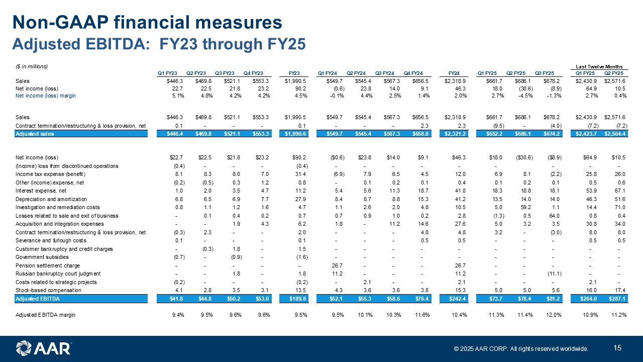 © 2025 AAR CORP. All rights reserved worldwide. 14 Adjusted EBITDA: FY20 through FY22 Non - GAAP financial measures ($ in millions) Q1 FY20 Q2 FY20 Q3 FY20 Q4 FY20 Q1 FY21 Q2 FY21 Q3 FY21 Q4 FY21 Q1 FY22 Q2 FY22 Q3 FY22 Q4 FY22 FY22 Sales $541.5 $560.9 $553.1 $416.5 $400.8 $403.6 $410.3 $437.6 $455.1 $436.6 $452.2 $476.1 $1,820.0 Net income (loss) 4.4 14.2 2.3 (16.5) (14.5) 8.2 28.1 14.0 11.5 20.8 22.5 23.9 78.7 Net income (loss) margin 0.8% 2.5% 0.4% -4.0% -3.6% 2.0% 6.8% 3.2% 2.5% 4.8% 5.0% 5.0% 4.3% Sales $541.5 $560.9 $553.1 $416.5 $400.8 $403.6 $410.3 $437.6 $455.1 $436.6 $452.2 $476.1 $1,820.0 Contract termination/restructuring & loss provision, net - - 9.8 7.5 1.9 (2.3) 1.5 (2.4) 1.0 (2.5) (0.2) (1.2) (2.9) Customer bankruptcy charge - - - - - 0.4 - - - - - - - Adjusted sales $541.5 $560.9 $562.9 $424.0 $402.7 $401.7 $411.8 $435.2 $456.1 $434.1 $452.0 $474.9 $1,817.1 Net income (loss) $4.4 $14.2 $2.3 ($16.5) ($14.5) $8.2 $28.1 $14.0 $11.5 $20.8 $22.5 $23.9 $78.7 (Income) loss from discontinued operations 12.7 5.9 0.3 1.5 0.6 6.2 3.0 0.7 (0.3) - 0.1 - (0.2) Income tax expense (benefit) 3.4 6.0 0.2 (4.0) (3.8) 5.2 12.0 4.8 3.9 7.9 8.2 6.6 26.6 Other (income) expense, net 0.2 0.2 0.2 1.5 (0.2) 0.7 (4.4) (0.4) (0.7) (0.3) (1.1) (0.1) (2.2) Interest expense, net 2.1 1.8 2.3 2.6 1.6 1.3 1.0 0.9 0.7 0.4 0.6 0.6 2.3 Depreciation and amortization 10.8 11.0 11.0 10.9 9.0 9.2 8.9 9.2 8.9 8.9 7.7 7.6 33.1 Investigation and remediation costs 3.1 2.4 2.7 1.8 1.3 2.8 0.3 - 0.2 0.8 1.6 1.1 3.7 Losses related to sale and exit of business - - - - 19.5 - - 0.7 - 1.3 - 0.4 1.7 Asset impairment and exit charges - - - 11.0 5.8 1.2 - - 2.3 0.6 0.5 0.1 3.5 Contract termination/restructuring & loss provision, net - - 24.7 6.6 2.2 4.5 4.0 (1.4) 6.7 (4.4) (1.1) (0.3) 0.9 Facility consolidation and repositioning costs - - - 4.9 2.0 0.4 - 2.1 0.1 0.1 - - 0.2 Severance and furlough costs 0.7 0.9 0.5 5.0 6.0 2.2 0.1 0.7 0.9 0.8 0.2 0.1 2.0 Customer bankruptcy and credit charges - - - 1.6 0.2 1.3 1.0 2.4 - 1.0 - - 1.0 Government subsidies - - - (2.8) (11.1) (18.7) (24.6) (1.8) (0.3) (2.5) (1.0) (1.1) (4.9) Costs related to strategic projects - - - 0.4 0.3 0.7 - - - - - 1.8 1.8 Stock-based compensation 4.3 2.8 3.2 (3.0) 2.7 1.8 2.3 2.4 3.1 1.6 1.1 2.4 8.2 Adjusted EBITDA $41.7 $45.2 $47.4 $21.5 $21.6 $27.0 $31.7 $34.3 $37.0 $37.0 $39.3 $43.1 $156.4 Adjusted EBITDA margin 7.7% 8.1% 8.4% 5.1% 5.4% 6.7% 7.7% 7.9% 8.1% 8.5% 8.7% 9.1% 8.6%