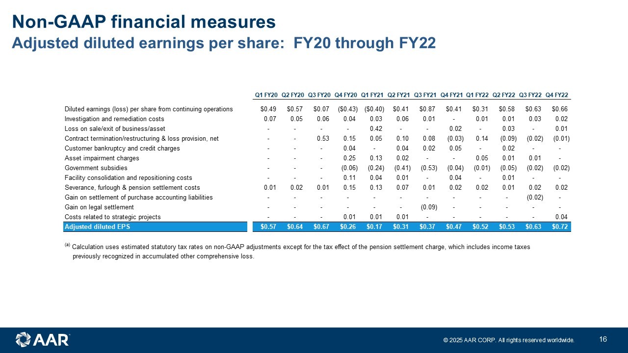 © 2025 AAR CORP. All rights reserved worldwide. 15 Adjusted EBITDA: FY23 through FY25 Non - GAAP financial measures ($ in millions) Q1 FY23 Q2 FY23 Q3 FY23 Q4 FY23 FY23 Q1 FY24 Q2 FY24 Q3 FY24 Q4 FY24 FY24 Q1 FY25 Q2 FY25 Q3 FY25 Q1 FY25 Q2 FY25 Sales $446.3 $469.8 $521.1 $553.3 $1,990.5 $549.7 $545.4 $567.3 $656.5 $2,318.9 $661.7 $686.1 $678.2 $2,430.9 $2,571.6 Net income (loss) 22.7 22.5 21.8 23.2 90.2 (0.6) 23.8 14.0 9.1 46.3 18.0 (30.6) (8.9) 64.9 10.5 Net income (loss) margin 5.1% 4.8% 4.2% 4.2% 4.5% -0.1% 4.4% 2.5% 1.4% 2.0% 2.7% -4.5% -1.3% 2.7% 0.4% Sales $446.3 $469.8 $521.1 $553.3 $1,990.5 $549.7 $545.4 $567.3 $656.5 $2,318.9 $661.7 $686.1 $678.2 $2,430.9 $2,571.6 Contract termination/restructuring & loss provision, net 0.1 - - - 0.1 - - - 2.3 2.3 (9.5) - (4.0) (7.2) (7.2) Adjusted sales $446.4 $469.8 $521.1 $553.3 $1,990.6 $549.7 $545.4 $567.3 $658.8 $2,321.2 $652.2 $686.1 $674.2 $2,423.7 $2,564.4 Net income (loss) $22.7 $22.5 $21.8 $23.2 $90.2 ($0.6) $23.8 $14.0 $9.1 $46.3 $18.0 ($30.6) ($8.9) $64.9 $10.5 (Income) loss from discontinued operations (0.4) - - - (0.4) - - - - - - - - - Income tax expense (benefit) 8.1 8.3 8.0 7.0 31.4 (6.9) 7.9 6.5 4.5 12.0 6.9 8.1 (2.2) 25.8 26.0 Other (income) expense, net (0.2) (0.5) 0.3 1.2 0.8 - 0.1 0.2 0.1 0.4 0.1 0.2 0.1 0.5 0.6 Interest expense, net 1.0 2.0 3.5 4.7 11.2 5.4 5.6 11.3 18.7 41.0 18.3 18.8 18.1 53.9 67.1 Depreciation and amortization 6.8 6.5 6.9 7.7 27.9 8.4 8.7 8.8 15.3 41.2 13.5 14.0 14.0 46.3 51.6 Investigation and remediation costs 0.8 1.1 1.2 1.6 4.7 1.1 2.6 2.0 4.8 10.5 5.0 59.2 1.1 14.4 71.0 Losses related to sale and exit of business - 0.1 0.4 0.2 0.7 0.7 0.9 1.0 0.2 2.8 (1.3) 0.5 64.0 0.8 0.4 Acquisition and integration expenses - - 1.9 4.3 6.2 1.8 - 11.2 14.6 27.6 5.0 3.2 3.5 30.8 34.0 Contract termination/restructuring & loss provision, net (0.3) 2.3 - - 2.0 - - - 4.8 4.8 3.2 - (3.0) 8.0 8.0 Severance and furlough costs 0.1 - - - 0.1 - - - 0.5 0.5 - - - 0.5 0.5 Customer bankruptcy and credit charges - (0.3) 1.8 - 1.5 - - - - - - - - - - Government subsidies (0.7) - (0.9) - (1.6) - - - - - - - - - - Pension settlement charge - - - - - 26.7 - - - 26.7 - - - - - Russian bankruptcy court judgment - - 1.8 - 1.8 11.2 - - - 11.2 - - (11.1) - - Costs related to strategic projects (0.2) - - - (0.2) - 2.1 - - 2.1 - - - 2.1 - Stock-based compensation 4.1 2.8 3.5 3.1 13.5 4.3 3.6 3.6 3.8 15.3 5.0 5.0 5.6 16.0 17.4 Adjusted EBITDA $41.8 $44.8 $50.2 $53.0 $189.8 $52.1 $55.3 $58.6 $76.4 $242.4 $73.7 $78.4 $81.2 $264.0 $287.1 Adjusted EBITDA margin 9.4% 9.5% 9.6% 9.6% 9.5% 9.5% 10.1% 10.3% 11.6% 10.4% 11.3% 11.4% 12.0% 10.9% 11.2% Last Twelve Months