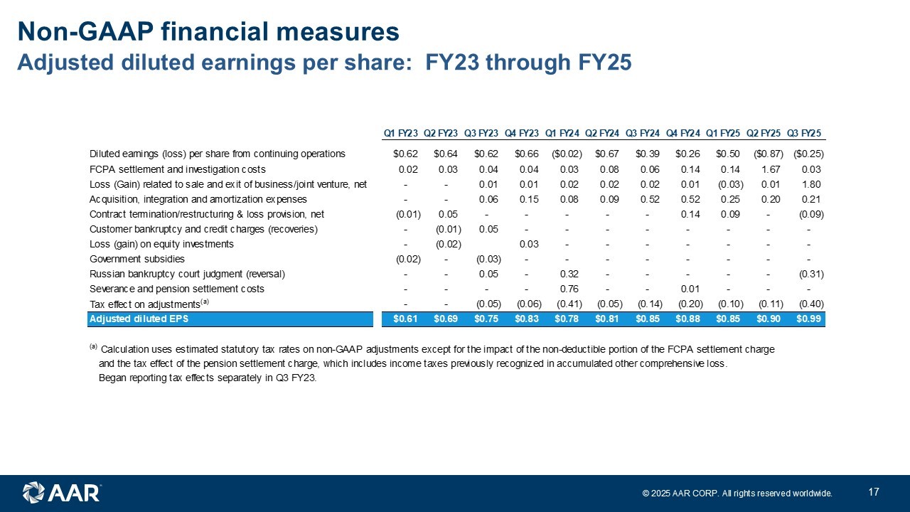 © 2025 AAR CORP. All rights reserved worldwide. 16 Adjusted diluted earnings per share: FY20 through FY22 Non - GAAP financial measures Q1 FY20 Q2 FY20 Q3 FY20 Q4 FY20 Q1 FY21 Q2 FY21 Q3 FY21 Q4 FY21Q1 FY22 Q2 FY22 Q3 FY22 Q4 FY22 Diluted earnings (loss) per share from continuing operations $0.49 $0.57 $0.07 ($0.43) ($0.40) $0.41 $0.87 $0.41 $0.31 $0.58 $0.63 $0.66 Investigation and remediation costs 0.07 0.05 0.06 0.04 0.03 0.06 0.01 - 0.01 0.01 0.03 0.02 Loss on sale/exit of business/asset - - - - 0.42 - - 0.02 - 0.03 - 0.01 Contract termination/restructuring & loss provision, net - - 0.53 0.15 0.05 0.10 0.08 (0.03) 0.14 (0.09) (0.02) (0.01) Customer bankruptcy and credit charges - - - 0.04 - 0.04 0.02 0.05 - 0.02 - - Asset impairment charges - - - 0.25 0.13 0.02 - - 0.05 0.01 0.01 - Government subsidies - - - (0.06) (0.24) (0.41) (0.53) (0.04) (0.01) (0.05) (0.02) (0.02) Facility consolidation and repositioning costs - - - 0.11 0.04 0.01 - 0.04 - 0.01 - - Severance, furlough & pension settlement costs 0.01 0.02 0.01 0.15 0.13 0.07 0.01 0.02 0.02 0.01 0.02 0.02 Gain on settlement of purchase accounting liabilities - - - - - - - - - - (0.02) - Gain on legal settlement - - - - - - (0.09) - - - - - Costs related to strategic projects - - - 0.01 0.01 0.01 - - - - - 0.04 Adjusted diluted EPS $0.57 $0.64 $0.67 $0.26 $0.17 $0.31 $0.37 $0.47 $0.52 $0.53 $0.63 $0.72 (a) Calculation uses estimated statutory tax rates on non-GAAP adjustments except for the tax effect of the pension settlement charge, which includes income taxes previously recognized in accumulated other comprehensive loss.