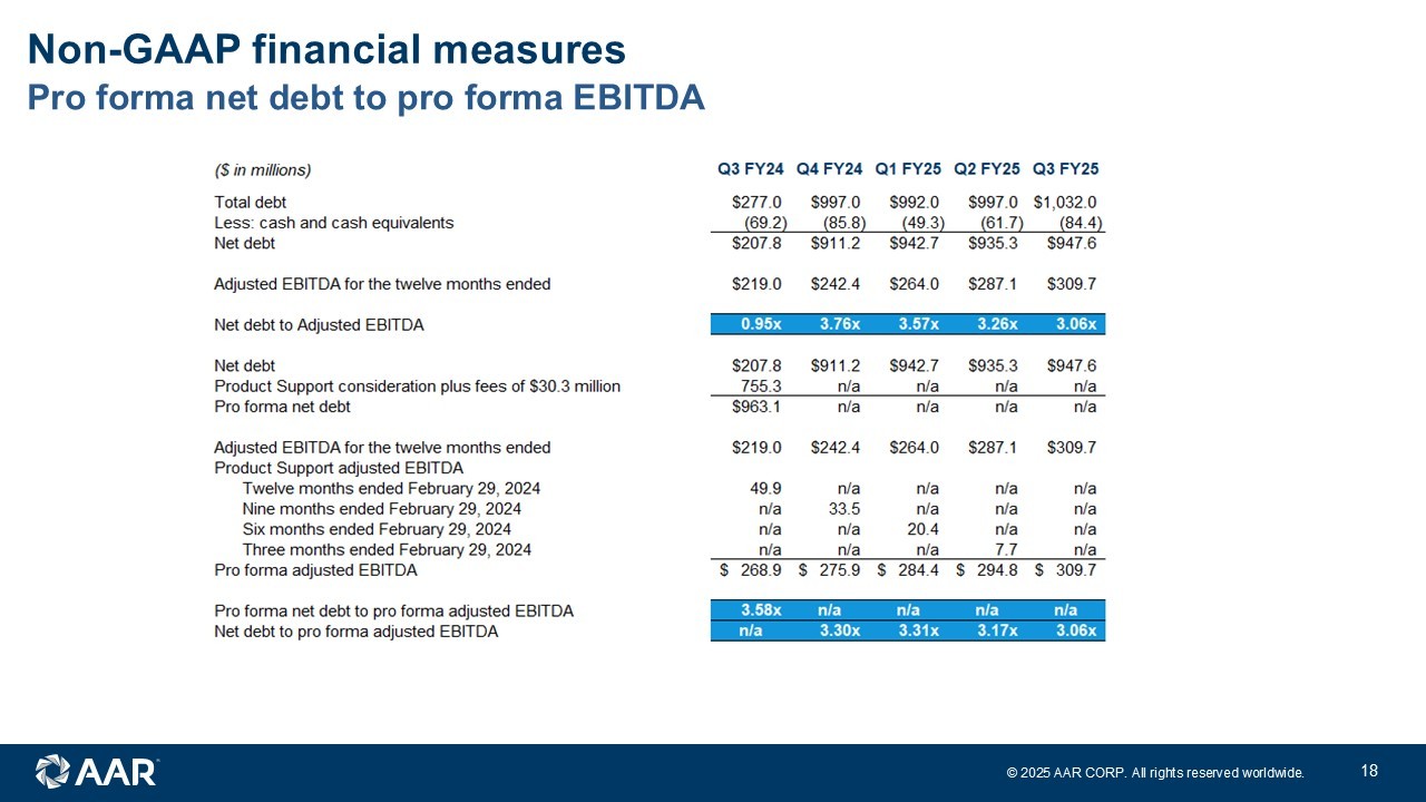 © 2025 AAR CORP. All rights reserved worldwide. 17 Adjusted diluted earnings per share: FY23 through FY25 Non - GAAP financial measures Q1 FY23 Q2 FY23 Q3 FY23 Q4 FY23 Q1 FY24 Q2 FY24 Q3 FY24 Q4 FY24 Q1 FY25 Q2 FY25 Q3 FY25 Diluted earnings (loss) per share from continuing operations $0.62 $0.64 $0.62 $0.66 ($0.02) $0.67 $0.39 $0.26 $0.50 ($0.87) ($0.25) FCPA settlement and investigation costs 0.02 0.03 0.04 0.04 0.03 0.08 0.06 0.14 0.14 1.67 0.03 Loss (Gain) related to sale and exit of business/joint venture, net - - 0.01 0.01 0.02 0.02 0.02 0.01 (0.03) 0.01 1.80 Acquisition, integration and amortization expenses - - 0.06 0.15 0.08 0.09 0.52 0.52 0.25 0.20 0.21 Contract termination/restructuring & loss provision, net (0.01) 0.05 - - - - - 0.14 0.09 - (0.09) Customer bankruptcy and credit charges (recoveries) - (0.01) 0.05 - - - - - - - - Loss (gain) on equity investments - (0.02) 0.03 - - - - - - - Government subsidies (0.02) - (0.03) - - - - - - - - Russian bankruptcy court judgment (reversal) - - 0.05 - 0.32 - - - - - (0.31) Severance and pension settlement costs - - - - 0.76 - - 0.01 - - - Tax effect on adjustments (a) - - (0.05) (0.06) (0.41) (0.05) (0.14) (0.20) (0.10) (0.11) (0.40) Adjusted diluted EPS $0.61 $0.69 $0.75 $0.83 $0.78 $0.81 $0.85 $0.88 $0.85 $0.90 $0.99 (a) Calculation uses estimated statutory tax rates on non-GAAP adjustments except for the impact of the non-deductible portion of the FCPA settlement charge and the tax effect of the pension settlement charge, which includes income taxes previously recognized in accumulated other comprehensive loss. Began reporting tax effects separately in Q3 FY23.